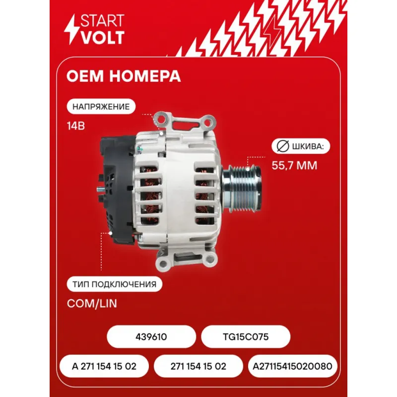 Генератор для автомобилей Mercedes-Benz C W204 (07-)/E W212 (09-) 1.8T 150A Описание: Оригинальный генератор STARTVOLT LG 1507 рассчитан на ток 150 А и напряжение 14 В. Изготовлен аналогично оригинальной конструкции. Шкив свободного хода (7PK, диаметр 55,7 мм) полностью совместим с оригинальными агрегатами. Подходит для автомобилей: MERCEDES-BENZ C-Class, E-Class, SPRINTER.. Если у вас есть вопросы по применяемости, мы всегда готовы помочь вам с подбором по VIN-НОМЕРУ ВАШЕГО АВТОМОБИЛЯ. Преимущества: - Полностью соответствует оригинальным узлам; - Высокоточная сборка с пооперационным контролем качества; - Каждый генератор проходит стендовое тестирование — протокол в комплекте; - Надёжность в любых условиях эксплуатации; - STARTVOLT 15 лет на рынке автоэлектрики — нам доверяют профессионалы; - Гарантия 2 года; - Сертифицирован по стандарту EAC (ЕАЭС) — соответствует требованиям безопасности и качества; Автомобильный генератор в сборе — готов к установке. Отличный выбор для надежной замены штатного генератора. Характеристики: Артикул: LG 1507 OEM номера: A 271 154 15 02, 271 154 15 02, A27115415020080, 439610, TG15C075 IDE код: 25 Скорость сигнала: H Напряжение, В: 14 Выходной ток, А: 150 Тип подключения: COM/LIN Диаметр шкива, мм: 55,7 Ременной шкив: с ременным шкивом свободного хода Количество крепежных отверстий: 4 Количество канавок шкива: 7 Направление вращения: По часовой стрелке Вылет шкива, мм: 30,7 Сопутствующий товар: Шкивы генераторов с обгонной муфтой: SGP 1508 Подходит для авто: Mercedes-Benz C-Class W204 (07-), C-Class W204 (07-), E-Class W212 (09-) Для проверки применяемости отправьте VIN автомобиля через вкладку "Есть вопросы о товаре?" Комплектация: Индивидуальный технический паспорт изделия (с фирменным ID) - 1 шт Генератор - 1 шт Паспорт изделия/гарантийный талон - 1 шт Гарантия: от 1 года.