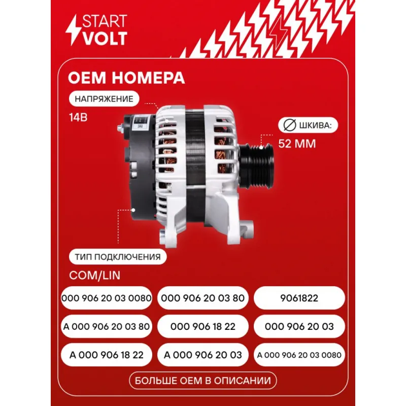 Генератор для автомобилей Mercedes-Benz C W204 (12-) 1.6T/GLK X204 (13-) 2.0T 150A Описание: Оригинальный генератор STARTVOLT LG 15041 рассчитан на ток 150 А и напряжение 14 В. Изготовлен аналогично оригинальной конструкции. Шкив свободного хода (6PK, диаметр 52 мм) полностью совместим с оригинальными агрегатами. Подходит для автомобилей: MERCEDES-BENZ C-Class, E-Class, GLK.. Если у вас есть вопросы по применяемости, мы всегда готовы помочь вам с подбором по VIN-НОМЕРУ ВАШЕГО АВТОМОБИЛЯ. Преимущества: - Полностью соответствует оригинальным узлам; - Высокоточная сборка с пооперационным контролем качества; - Каждый генератор проходит стендовое тестирование — протокол в комплекте; - Надёжность в любых условиях эксплуатации; - STARTVOLT 15 лет на рынке автоэлектрики — нам доверяют профессионалы; - Гарантия 2 года; - Сертифицирован по стандарту EAC (ЕАЭС) — соответствует требованиям безопасности и качества; Автомобильный генератор в сборе — готов к установке. Отличный выбор для надежной замены штатного генератора. Характеристики: Артикул: LG 15041 OEM номера: A 000 906 18 22, A 000 906 20 03, A 000 906 20 03 0080, A 000 906 20 03 80, 000 906 18 22, 000 906 20 03, 000 906 20 03 0080, 000 906 20 03 80, 9061822, 9062003, 0 125 711 080 IDE код: 24 Скорость сигнала: H Напряжение, В: 14 Выходной ток, А: 150 Тип подключения: COM/LIN Диаметр шкива, мм: 52 Ременной шкив: с ременным шкивом свободного хода Количество крепежных отверстий: 2 Количество канавок шкива: 6 Направление вращения: По часовой стрелке Вылет шкива, мм: 34 Сопутствующий товар: Шкивы генераторов с обгонной муфтой: SGP 15041 Подходит для авто: Mercedes-Benz C-Class W204 (07-) Для проверки применяемости отправьте VIN автомобиля через вкладку "Есть вопросы о товаре?" Комплектация: Индивидуальный технический паспорт изделия (с фирменным ID) - 1 шт Паспорт изделия/гарантийный талон - 1 шт Генератор - 1 шт Гарантия: от 1 года.