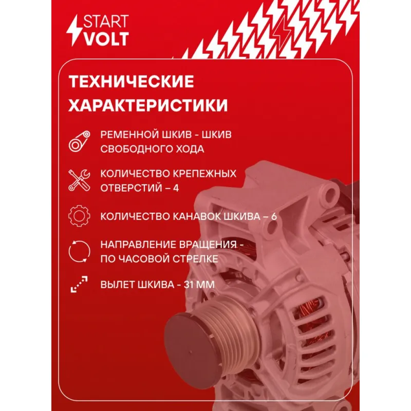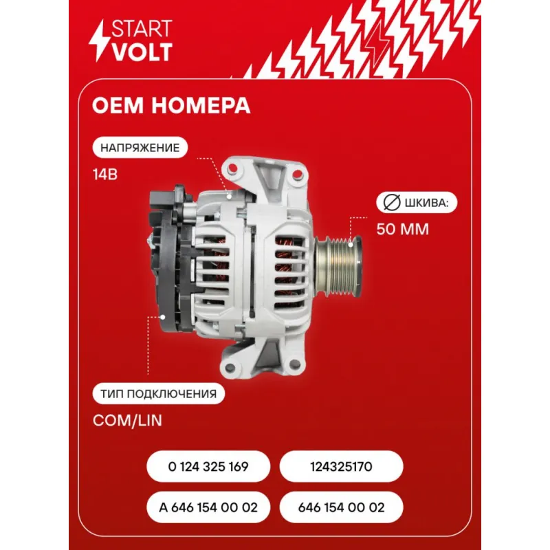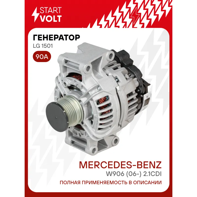 Генератор для автомобилей Mercedes-Benz Sprinter W906 (06-) 2.1CDI 90A Описание: Оригинальный генератор STARTVOLT LG 1501 рассчитан на ток 90 А и напряжение 14 В. Изготовлен аналогично оригинальной конструкции. Шкив свободного хода (6PK, диаметр 50 мм) полностью совместим с оригинальными агрегатами. Подходит для автомобилей: MERCEDES-BENZ SPRINTER.. Если у вас есть вопросы по применяемости, мы всегда готовы помочь вам с подбором по VIN-НОМЕРУ ВАШЕГО АВТОМОБИЛЯ. Преимущества: - Полностью соответствует оригинальным узлам; - Высокоточная сборка с пооперационным контролем качества; - Каждый генератор проходит стендовое тестирование — протокол в комплекте; - Надёжность в любых условиях эксплуатации; - STARTVOLT 15 лет на рынке автоэлектрики — нам доверяют профессионалы; - Гарантия 2 года; - Сертифицирован по стандарту EAC (ЕАЭС) — соответствует требованиям безопасности и качества; Автомобильный генератор в сборе — готов к установке. Отличный выбор для надежной замены штатного генератора. Характеристики: Артикул: LG 1501 OEM номера: A 646 154 00 02, 646 154 00 02, 0 124 325 169, 0124325170 IDE код: 8 Скорость сигнала: H Напряжение, В: 14 Выходной ток, А: 90 Тип подключения: COM/LIN Диаметр шкива, мм: 50 Ременной шкив: с ременным шкивом свободного хода Количество крепежных отверстий: 4 Количество канавок шкива: 6 Направление вращения: По часовой стрелке Вылет шкива, мм: 31 Сопутствующий товар: Шкивы генераторов с обгонной муфтой: SGP 1580 Комплектация: Индивидуальный технический паспорт изделия (с фирменным ID) - 1 шт Паспорт изделия/гарантийный талон - 1 шт Генератор - 1 шт Гарантия: от 1 года.