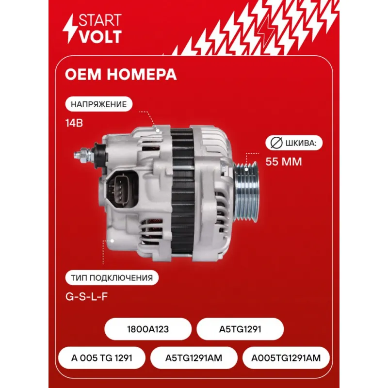 Генератор для автомобилей Mitsubishi Lancer X (07-) 1.5i/1.6i/ASX (10-) 1.6i 85A Описание: Оригинальный генератор STARTVOLT LG 1115 рассчитан на ток 85 А и напряжение 14 В. Изготовлен аналогично оригинальной конструкции. с многоручейковым ручейковым шкивом шкив (5PK, диаметр 55 мм) полностью совместим с оригинальными агрегатами. Подходит для автомобилей: MITSUBISHI COLT, LANCER, ASX.. Если у вас есть вопросы по применяемости, мы всегда готовы помочь вам с подбором по VIN-НОМЕРУ ВАШЕГО АВТОМОБИЛЯ. Преимущества: - Полностью соответствует оригинальным узлам; - Высокоточная сборка с пооперационным контролем качества; - Каждый генератор проходит стендовое тестирование — протокол в комплекте; - Надёжность в любых условиях эксплуатации; - STARTVOLT 15 лет на рынке автоэлектрики — нам доверяют профессионалы; - Гарантия 2 года; - Сертифицирован по стандарту EAC (ЕАЭС) — соответствует требованиям безопасности и качества; Автомобильный генератор в сборе — готов к установке. Отличный выбор для надежной замены штатного генератора. Характеристики: Артикул: LG 1115 OEM номера: 1800A123, A 005 TG 1291, A5TG1291, A5TG1291AM, A005TG1291AM Напряжение, В: 14 Выходной ток, А: 85 Тип подключения: G-S-L-F Диаметр шкива, мм: 55 Ременной шкив: с многоручейковым ручейковым шкивом Количество крепежных отверстий: 2 Количество канавок шкива: 5 Направление вращения: По часовой стрелке Сопутствующий товар: Регуляторы напряжения генераторов: VRR 1109 Подходит для авто: Mitsubishi Colt (96-), Lancer X (07-), ASX (10-), Colt (96-) Для проверки применяемости отправьте VIN автомобиля через вкладку "Есть вопросы о товаре?" Комплектация: Генератор - 1 шт Паспорт изделия/гарантийный талон - 1 шт Индивидуальный технический паспорт изделия (с фирменным ID) - 1 шт Гарантия: от 1 года.