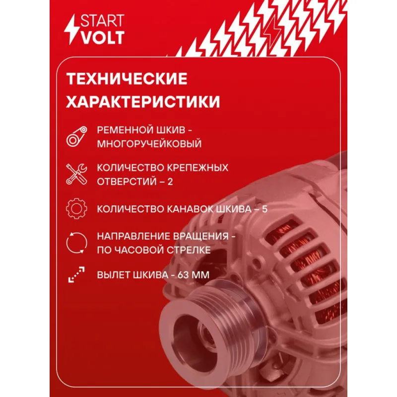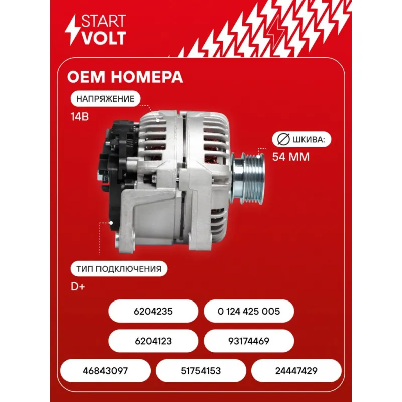Генератор для автомобилей Opel Astra H (04-)/Zafira B (05-) 1.6i/1.8i старого образца 120A Описание: Оригинальный генератор STARTVOLT LG 2160 рассчитан на ток 120 А и напряжение 14 В. Изготовлен аналогично оригинальной конструкции. с многоручейковым ручейковым шкивом шкив (5PK, диаметр 54 мм) полностью совместим с оригинальными агрегатами. Подходит для автомобилей: ALFA ROMEO 159, FIAT CROMA, OPEL ZAFIRA, ASTRA, MERIVA, SIGNUM, VECTRA.. Если у вас есть вопросы по применяемости, мы всегда готовы помочь вам с подбором по VIN-НОМЕРУ ВАШЕГО АВТОМОБИЛЯ. Преимущества: - Полностью соответствует оригинальным узлам; - Высокоточная сборка с пооперационным контролем качества; - Каждый генератор проходит стендовое тестирование — протокол в комплекте; - Надёжность в любых условиях эксплуатации; - STARTVOLT 15 лет на рынке автоэлектрики — нам доверяют профессионалы; - Гарантия 2 года; - Сертифицирован по стандарту EAC (ЕАЭС) — соответствует требованиям безопасности и качества; Автомобильный генератор в сборе — готов к установке. Отличный выбор для надежной замены штатного генератора. Характеристики: Артикул: LG 2160 OEM номера: 46843097, 51754153, 24447429, 6204123, 93174469, 6204235, 0 124 425 005 Напряжение, В: 14 Выходной ток, А: 120 Тип подключения: D+ Диаметр шкива, мм: 54 Ременной шкив: с многоручейковым ручейковым шкивом Количество крепежных отверстий: 2 Количество канавок шкива: 5 Направление вращения: По часовой стрелке Вылет шкива, мм: 63 Сопутствующий товар: Регуляторы напряжения генераторов: VRR 2160 Подходит для авто: Opel Astra H (04-), Zafira B (05-) Для проверки применяемости отправьте VIN автомобиля через вкладку "Есть вопросы о товаре?" Комплектация: Индивидуальный технический паспорт изделия (с фирменным ID) - 1 шт Паспорт изделия/гарантийный талон - 1 шт Генератор - 1 шт Гарантия: от 1 года.