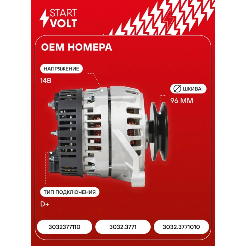Генератор для автомобилей ПАЗ 3205 с дв. ЗМЗ-5234.10 120A Описание: Оригинальный генератор STARTVOLT LG 0353 рассчитан на ток 120 А и напряжение 14 В. Изготовлен аналогично оригинальной конструкции. с ремённым шкивом шкив (диаметр 96 мм) полностью совместим с оригинальными агрегатами. Подходит для автомобилей: PAZ 3205.. Если у вас есть вопросы по применяемости, мы всегда готовы помочь вам с подбором по VIN-НОМЕРУ ВАШЕГО АВТОМОБИЛЯ. Преимущества: - Полностью соответствует оригинальным узлам; - Высокоточная сборка с пооперационным контролем качества; - Каждый генератор проходит стендовое тестирование — протокол в комплекте; - Надёжность в любых условиях эксплуатации; - STARTVOLT 15 лет на рынке автоэлектрики — нам доверяют профессионалы; - Гарантия 2 года; - Сертифицирован по стандарту EAC (ЕАЭС) — соответствует требованиям безопасности и качества; Автомобильный генератор в сборе — готов к установке. Отличный выбор для надежной замены штатного генератора. Характеристики: Артикул: LG 0353 OEM номера: 3032377110, 3032.3771, 3032.3771010 Напряжение, В: 14 Выходной ток, А: 120 Тип подключения: D+ Диаметр шкива, мм: 96 Ременной шкив: с ремённым шкивом Количество крепежных отверстий: 2 Количество канавок шкива: 1 Направление вращения: По часовой стрелке Вылет шкива, мм: 49 Подходит для авто: ПАЗ 3205 Для проверки применяемости отправьте VIN автомобиля через вкладку "Есть вопросы о товаре?" Комплектация: Генератор - 1 шт Паспорт изделия/гарантийный талон - 1 шт Индивидуальный технический паспорт изделия (с фирменным ID) - 1 шт Гарантия: от 1 года.