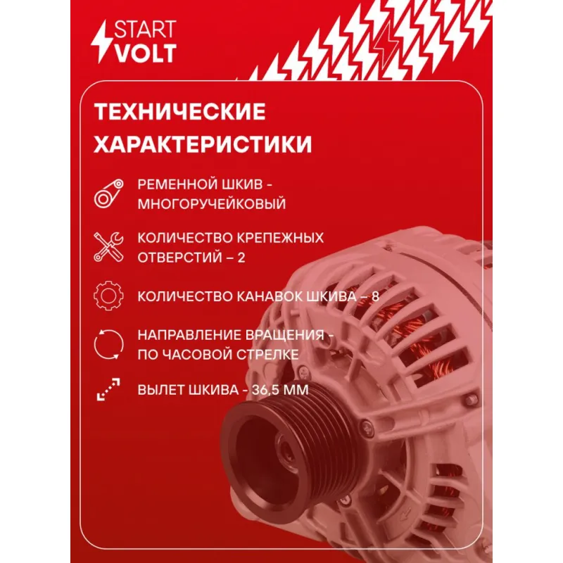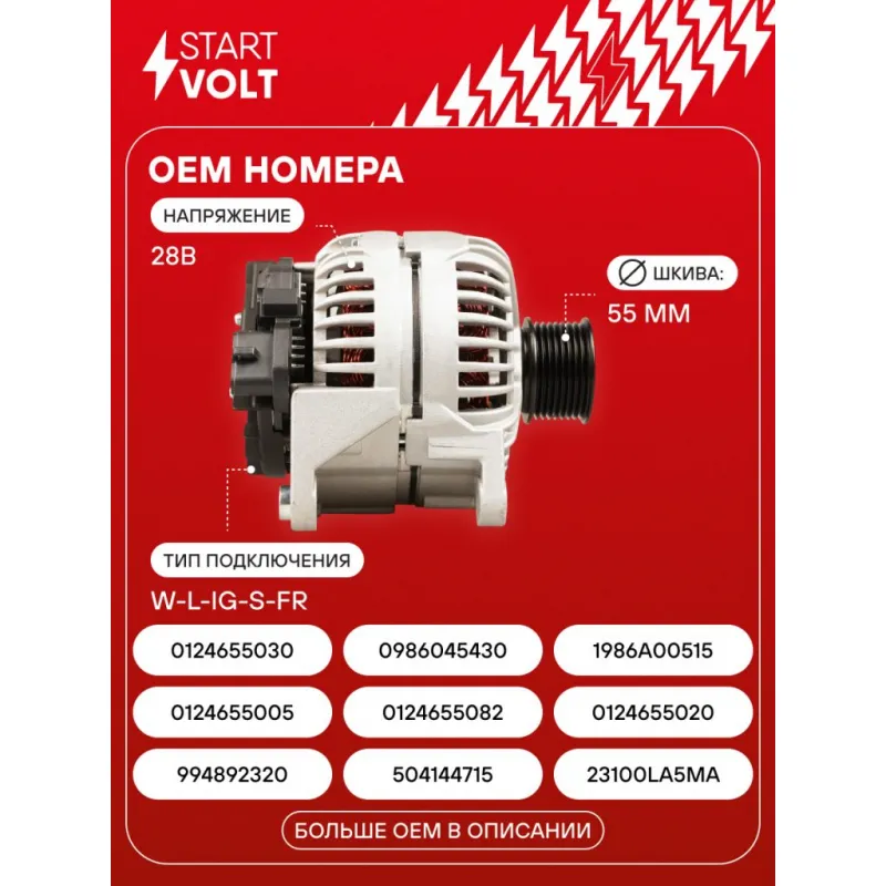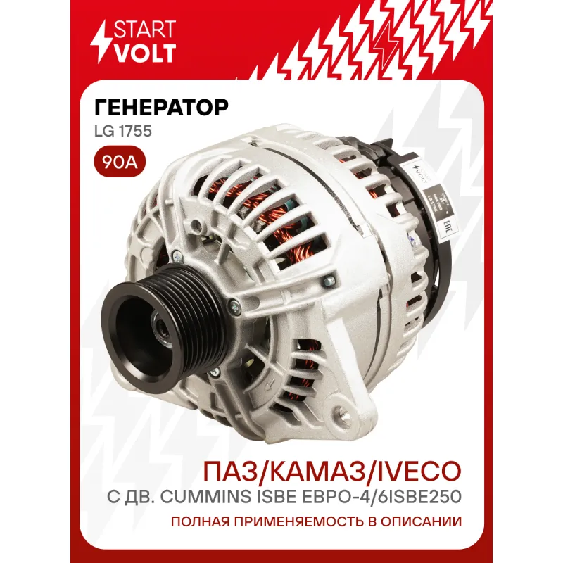 Генератор для автомобилей ПАЗ/КАМАЗ/IVECO с дв. CUMMINS ISBe ЕВРО-4/6ISBe250 90A Описание: Оригинальный генератор STARTVOLT LG 1755 рассчитан на ток 90 А и напряжение 28 В. Изготовлен аналогично оригинальной конструкции. с многоручейковым ручейковым шкивом шкив (8PK, диаметр 55 мм) полностью совместим с оригинальными агрегатами. Подходит для автомобилей: HEULIEZ GX 2, GX 3, IRISBUS PROWAY, EUROMIDI, ACCESS BUS, IVECO EUROCARGO, TECTOR, EUROFIRE, TEMSA AVENUE.. Если у вас есть вопросы по применяемости, мы всегда готовы помочь вам с подбором по VIN-НОМЕРУ ВАШЕГО АВТОМОБИЛЯ. Преимущества: - Полностью соответствует оригинальным узлам; - Высокоточная сборка с пооперационным контролем качества; - Каждый генератор проходит стендовое тестирование — протокол в комплекте; - Надёжность в любых условиях эксплуатации; - STARTVOLT 15 лет на рынке автоэлектрики — нам доверяют профессионалы; - Гарантия 2 года; - Сертифицирован по стандарту EAC (ЕАЭС) — соответствует требованиям безопасности и качества; Автомобильный генератор в сборе — готов к установке. Отличный выбор для надежной замены штатного генератора. Характеристики: Артикул: LG 1755 OEM номера: 994892320, 504144715, 23100LA5MA, 0124655005, 0124655082, 0124655020, 0124655030, 0986045430, 1986A00515, 1986A00545, 1986A00966, 1986A00973, 5259578, 4892320 Напряжение, В: 28 Выходной ток, А: 90 Тип подключения: W-L-IG-S-FR Диаметр шкива, мм: 55 Ременной шкив: с многоручейковым ручейковым шкивом Количество крепежных отверстий: 2 Количество канавок шкива: 8 Направление вращения: По часовой стрелке Вылет шкива, мм: 36,5 Сопутствующий товар: Регуляторы напряжения генераторов: VRR 0741 Сопутствующий товар: Мосты диодные генераторов: VDB 0741 Комплектация: Индивидуальный технический паспорт изделия (с фирменным ID) - 1 шт Паспорт изделия/гарантийный талон - 1 шт Генератор - 1 шт Гарантия: от 1 года.