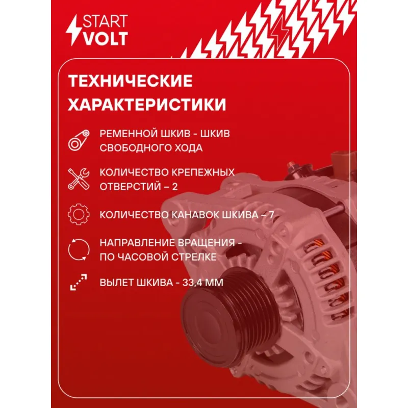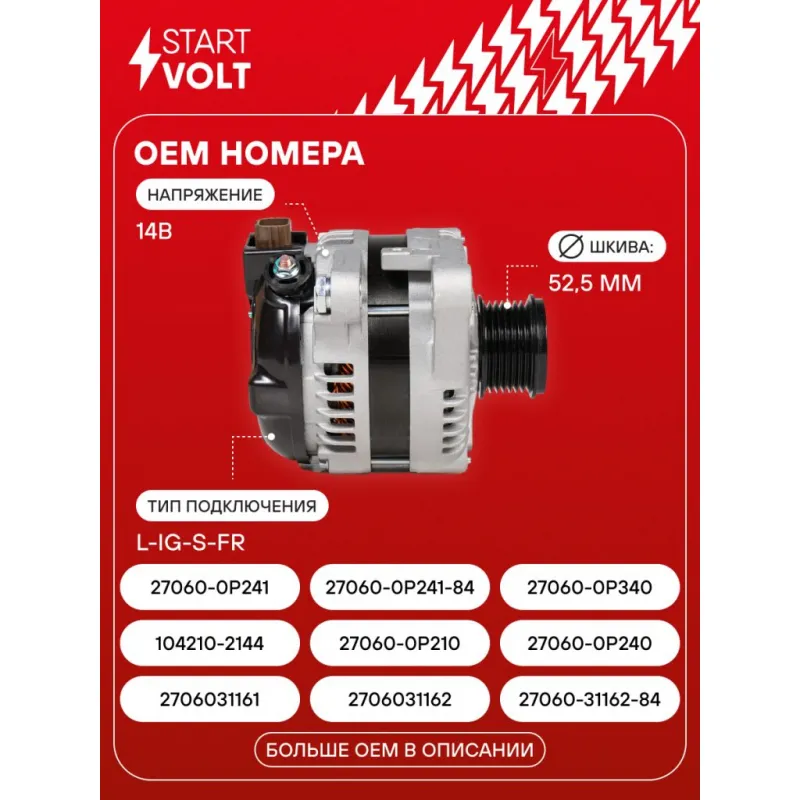 Генератор для автомобилей Toyota Highlander (08-)/Camry V50 (11-)/Lexus RX (09-) 3.5i 150A Описание: Оригинальный генератор STARTVOLT LG 1963 рассчитан на ток 150 А и напряжение 14 В. Изготовлен аналогично оригинальной конструкции. Шкив свободного хода (7PK, диаметр 52,5 мм) полностью совместим с оригинальными агрегатами. Подходит для автомобилей: LEXUS RX, TOYOTA CAMRY, HIGHLANDER / KLUGER.. Если у вас есть вопросы по применяемости, мы всегда готовы помочь вам с подбором по VIN-НОМЕРУ ВАШЕГО АВТОМОБИЛЯ. Преимущества: - Полностью соответствует оригинальным узлам; - Высокоточная сборка с пооперационным контролем качества; - Каждый генератор проходит стендовое тестирование — протокол в комплекте; - Надёжность в любых условиях эксплуатации; - STARTVOLT 15 лет на рынке автоэлектрики — нам доверяют профессионалы; - Гарантия 2 года; - Сертифицирован по стандарту EAC (ЕАЭС) — соответствует требованиям безопасности и качества; Автомобильный генератор в сборе — готов к установке. Отличный выбор для надежной замены штатного генератора. Характеристики: Артикул: LG 1963 OEM номера: 2706031161, 2706031162, 27060-31162-84, 104210-2144, 27060-0P210, 27060-0P240, 27060-0P241, 27060-0P241-84, 27060-0P340, 27060-31330, 27060-31331, 104210-5510, 104210-5511, 104210-5512, 104210-5513, 104210-5514, 104210-5515, 104211-8461, 104211-8810, 27060-31160 Напряжение, В: 14 Выходной ток, А: 150 Тип подключения: L-IG-S-FR Диаметр шкива, мм: 52,5 Ременной шкив: с ременным шкивом свободного хода Количество крепежных отверстий: 2 Количество канавок шкива: 7 Направление вращения: По часовой стрелке Вылет шкива, мм: 33,4 Сопутствующий товар: Шкивы генераторов с обгонной муфтой: SGP 1902 Сопутствующий товар: Мосты диодные генераторов: VDB 1950 Подходит для авто: Lexus RX III (09-) Toyota Highlander (08-), Camry V50 (11-) Для проверки применяемости отправьте VIN автомобиля через вкладку "Есть вопросы о товаре?" Комплектация: Генератор - 1 шт Индивидуальный технический паспорт изделия (с фирменным ID) - 1 шт Паспорт изделия/гарантийный талон - 1 шт Гарантия: от 1 года.