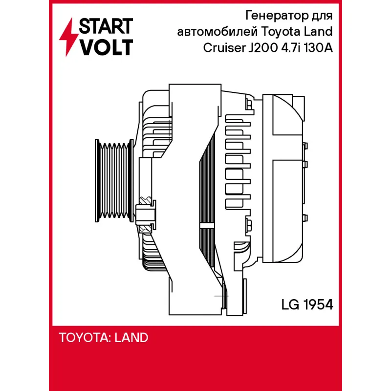 Генератор для автомобилей Toyota Land Cruiser J200 (08-) 4.7i 130A Характеристики: Артикул: LG 1954 OEM номера: 27060-50380, 27060-50320, 27060-50320-84, 27060-50350, 1042103440, 1042103441, 1042104550, 1042105620 Направление вращения: по часовой стрелке Выходной ток, А: 130 Напряжение, В: 14 Вылет шкива, мм: 89,3 Тип подключения: L-IG-S-FR Диаметр шкива, мм: 57,1 Ременной шкив: с многоручейковым ручейковым шкивом Количество крепежных отверстий: 3 Количество канавок шкива: 6 Комплектация: Генератор - 1 шт Индивидуальный технический паспорт изделия (с фирменным ID) - 1 шт Паспорт изделия/гарантийный талон - 1 шт Гарантия: от 1 года.