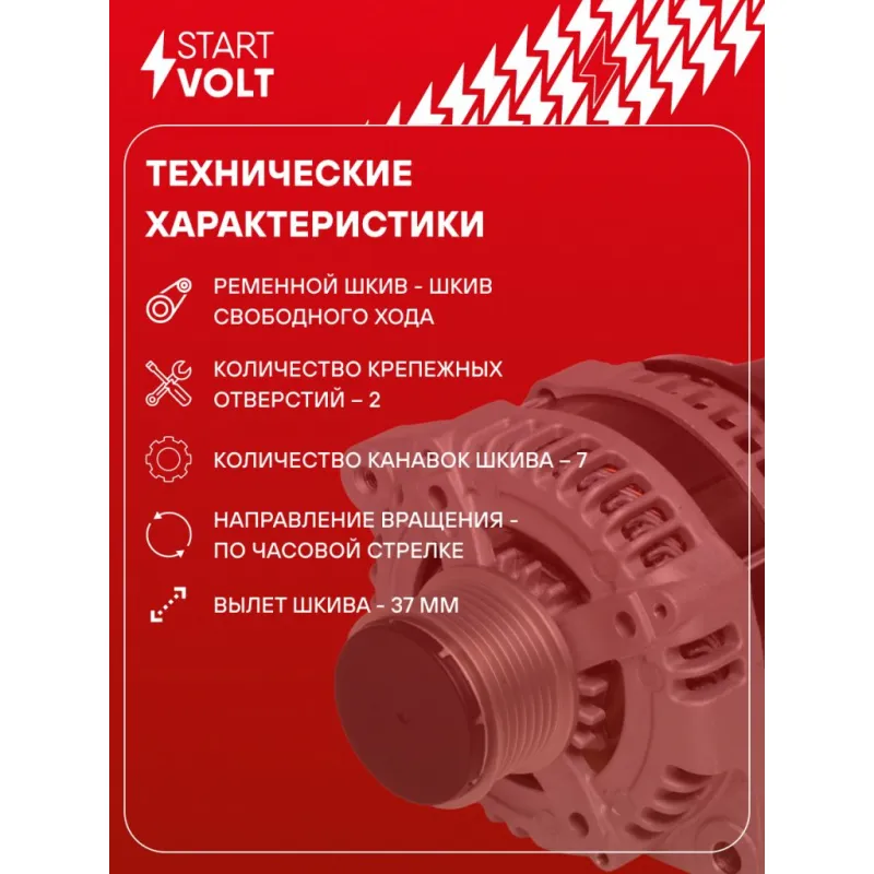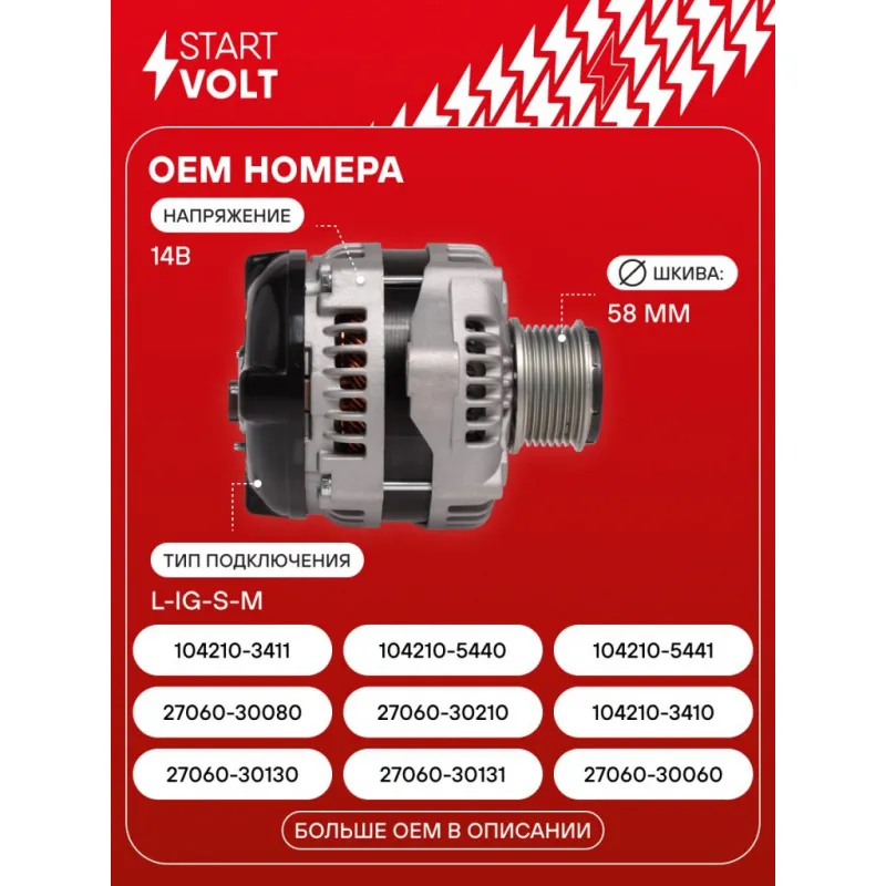 Генератор для автомобилей Toyota Land Cruiser Prado J15 (09-) 3.0D 100A Описание: Оригинальный генератор STARTVOLT LG 1915D рассчитан на ток 100 А и напряжение 14 В. Изготовлен аналогично оригинальной конструкции. Шкив свободного хода (7PK, диаметр 58 мм) полностью совместим с оригинальными агрегатами. Подходит для автомобилей: TOYOTA LAND CRUISER, DYNA.. Если у вас есть вопросы по применяемости, мы всегда готовы помочь вам с подбором по VIN-НОМЕРУ ВАШЕГО АВТОМОБИЛЯ. Преимущества: - Полностью соответствует оригинальным узлам; - Высокоточная сборка с пооперационным контролем качества; - Каждый генератор проходит стендовое тестирование — протокол в комплекте; - Надёжность в любых условиях эксплуатации; - STARTVOLT 15 лет на рынке автоэлектрики — нам доверяют профессионалы; - Гарантия 2 года; - Сертифицирован по стандарту EAC (ЕАЭС) — соответствует требованиям безопасности и качества; Автомобильный генератор в сборе — готов к установке. Отличный выбор для надежной замены штатного генератора. Характеристики: Артикул: LG 1915D OEM номера: 27060-30130, 27060-30131, 27060-30060, 27060-30080, 27060-30210, 104210-3410, 104210-3411, 104210-5440, 104210-5441, 104210-5442, DAN1070 Напряжение, В: 14 Выходной ток, А: 100 Тип подключения: L-IG-S-M Диаметр шкива, мм: 58 Ременной шкив: с ременным шкивом свободного хода Количество крепежных отверстий: 2 Количество канавок шкива: 7 Направление вращения: По часовой стрелке Вылет шкива, мм: 37 Сопутствующий товар: Шкивы генераторов с обгонной муфтой: SGP 1901 Сопутствующий товар: Мосты диодные генераторов: VDB 1915D Подходит для авто: Toyota Land Cruiser Prado 150 (09-) Для проверки применяемости отправьте VIN автомобиля через вкладку "Есть вопросы о товаре?" Комплектация: Индивидуальный технический паспорт изделия (с фирменным ID) - 1 шт Генератор - 1 шт Паспорт изделия/гарантийный талон - 1 шт Гарантия: от 1 года.