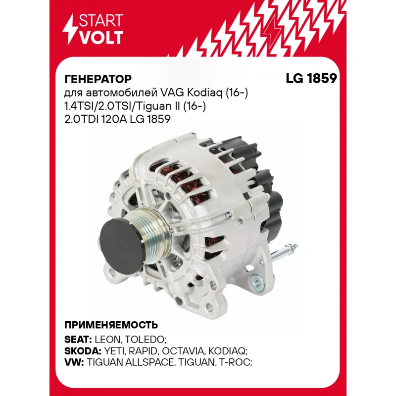 Генератор для автомобилей VAG Kodiaq (16-) 1.4TSI/2.0TSI/Tiguan II (16-) 2.0TDI 120A Описание: Оригинальный генератор STARTVOLT LG 1859 рассчитан на ток 120 А и напряжение 14 В. Изготовлен аналогично оригинальной конструкции. Многоручейковый ременной шкив (6PK, диаметр 50 мм) полностью совместим с оригинальными агрегатами. Подходит для автомобилей: SEAT LEON, TOLEDO, SKODA YETI, RAPID, OCTAVIA, KODIAQ, VW TIGUAN, T-ROC, GOLF.. Если у вас есть вопросы по применяемости, мы всегда готовы помочь вам с подбором по VIN-НОМЕРУ ВАШЕГО АВТОМОБИЛЯ. Преимущества: - Полностью соответствует оригинальным узлам; - Высокоточная сборка с пооперационным контролем качества; - Каждый генератор проходит стендовое тестирование — протокол в комплекте; - Надёжность в любых условиях эксплуатации; - STARTVOLT 15 лет на рынке автоэлектрики — нам доверяют профессионалы; - Гарантия 2 года; - Сертифицирован по стандарту EAC (ЕАЭС) — соответствует требованиям безопасности и качества; Автомобильный генератор в сборе — готов к установке. Отличный выбор для надежной замены штатного генератора. Характеристики: Артикул: LG 1859 OEM номера: 03L 903 023 J, 03L903023JX, 03L903023S, 03L903023SX, 3L903023J, 3L903023S, 3L903023SX, 439874, TG12C113 Направление вращения: по часовой стрелке Выходной ток, А: 120 Напряжение, В: 14 Вылет шкива, мм: 39 Тип подключения: COM/LIN Диаметр шкива, мм: 50 Ременной шкив: с ременным шкивом свободного хода Количество крепежных отверстий: 2 Количество канавок шкива: 6 IDE код: 17 Скорость сигнала: LMH Комплектация: Паспорт изделия/гарантийный талон - 1 шт Генератор - 1 шт Индивидуальный технический паспорт изделия (с фирменным ID) - 1 шт Гарантия: от 1 года.
