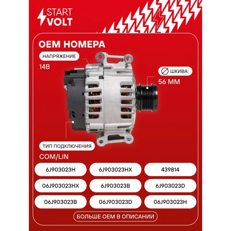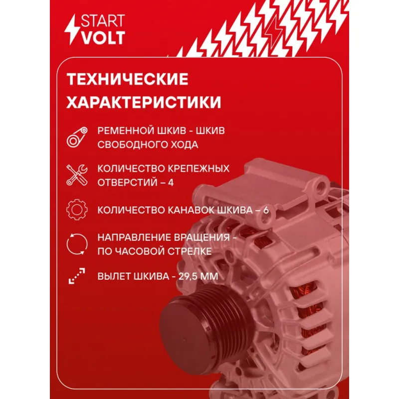 Генератор для автомобилей VAG Octavia A7 (12-)/Tiguan II (16-) 1.8TFSI/2.0TFSI 140A Описание: Оригинальный генератор STARTVOLT LG 1837 рассчитан на ток 140 А и напряжение 14 В. Изготовлен аналогично оригинальной конструкции. Шкив свободного хода (6PK, диаметр 56 мм) полностью совместим с оригинальными агрегатами. Подходит для автомобилей: AUDI A1, A3, A6, Q3, TT, SEAT ALHAMBRA, ATECA, EXEO, IBIZA, LEON, SKODA OCTAVIA, SUPERB, VW ARTEON, BEETLE, GOLF, T6, PASSAT, POLO, SCIROCCO, SHARAN, T-ROC, TIGUAN, TOURAN, T5.. Если у вас есть вопросы по применяемости, мы всегда готовы помочь вам с подбором по VIN-НОМЕРУ ВАШЕГО АВТОМОБИЛЯ. Преимущества: - Полностью соответствует оригинальным узлам; - Высокоточная сборка с пооперационным контролем качества; - Каждый генератор проходит стендовое тестирование — протокол в комплекте; - Надёжность в любых условиях эксплуатации; - STARTVOLT 15 лет на рынке автоэлектрики — нам доверяют профессионалы; - Гарантия 2 года; - Сертифицирован по стандарту EAC (ЕАЭС) — соответствует требованиям безопасности и качества; Автомобильный генератор в сборе — готов к установке. Отличный выбор для надежной замены штатного генератора. Характеристики: Артикул: LG 1837 OEM номера: 06J903023B, 06J903023D, 06J903023H, 06J903023HX, 6J903023B, 6J903023D, 6J903023H, 6J903023HX, 439814, TG14C025, 6K903024AX, 6K903024A, 6J903023DX, 6J903023BX, 06J903023DX, 06J903023BX IDE код: 25 Скорость сигнала: LMH Напряжение, В: 14 Выходной ток, А: 140 Тип подключения: COM/LIN Диаметр шкива, мм: 56 Ременной шкив: с ременным шкивом свободного хода Количество крепежных отверстий: 4 Количество канавок шкива: 6 Направление вращения: По часовой стрелке Вылет шкива, мм: 29,5 Сопутствующий товар: Регуляторы напряжения генераторов: VRR 1823 Сопутствующий товар: Шкивы генераторов с обгонной муфтой: SGP 1806 Комплектация: Паспорт изделия/гарантийный талон - 1 шт Генератор - 1 шт Индивидуальный технический паспорт изделия (с фирменным ID) - 1 шт Гарантия: от 1 года.