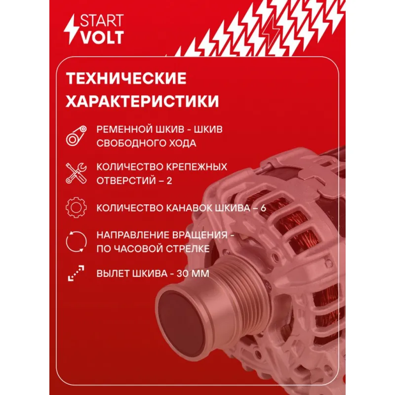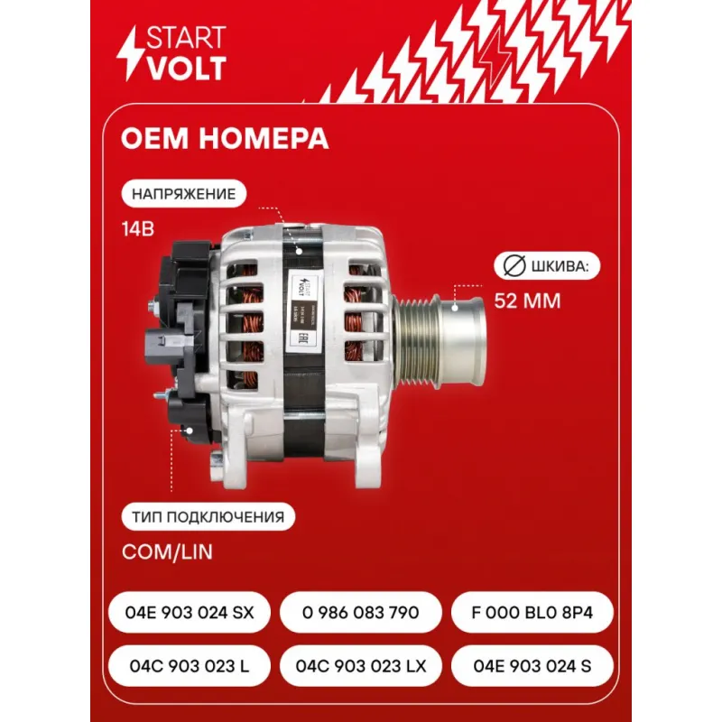 Генератор для автомобилей VAG Octavia A7 (12-)/Tiguan II (16-)/Karoq (19-) 1.4TSI 140A Описание: Оригинальный генератор STARTVOLT LG 1835 рассчитан на ток 140 А и напряжение 14 В. Изготовлен аналогично оригинальной конструкции. Шкив свободного хода (6PK, диаметр 52 мм) полностью совместим с оригинальными агрегатами. Подходит для автомобилей: AUDI A1, A3, Q2, Q3, SEAT ALHAMBRA, ARONA, ATECA, IBIZA, LEON, TOLEDO, SKODA FABIA, KAROQ, KODIAQ, OCTAVIA, RAPID, SUPERB, VW ARTEON, BEETLE, CADDY, CC, GOLF, JETTA, PASSAT, POLO, SCIROCCO, SHARAN, T-CROSS / TAIGUN, T-ROC, TIGUAN, TOURAN.. Если у вас есть вопросы по применяемости, мы всегда готовы помочь вам с подбором по VIN-НОМЕРУ ВАШЕГО АВТОМОБИЛЯ. Преимущества: - Полностью соответствует оригинальным узлам; - Высокоточная сборка с пооперационным контролем качества; - Каждый генератор проходит стендовое тестирование — протокол в комплекте; - Надёжность в любых условиях эксплуатации; - STARTVOLT 15 лет на рынке автоэлектрики — нам доверяют профессионалы; - Гарантия 2 года; - Сертифицирован по стандарту EAC (ЕАЭС) — соответствует требованиям безопасности и качества; Автомобильный генератор в сборе — готов к установке. Отличный выбор для надежной замены штатного генератора. Характеристики: Артикул: LG 1835 OEM номера: 04C 903 023 L, 04C 903 023 LX, 04E 903 024 S, 04E 903 024 SX, 04C903023T, 04C903023TX, 04E903015P, 04E903015PX, 04E903023B, 04E903023J, 04E903023JX, 0 986 083 790, F 000 BL0 8P4 IDE код: 24 Скорость сигнала: H Напряжение, В: 14 Выходной ток, А: 140 Тип подключения: COM/LIN Диаметр шкива, мм: 52 Ременной шкив: с ременным шкивом свободного хода Количество крепежных отверстий: 2 Количество канавок шкива: 6 Направление вращения: По часовой стрелке Вылет шкива, мм: 30 Комплектация: Паспорт изделия/гарантийный талон - 1 шт Индивидуальный технический паспорт изделия (с фирменным ID) - 1 шт Генератор - 1 шт Гарантия: от 1 года.