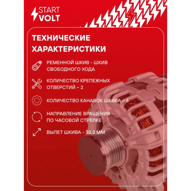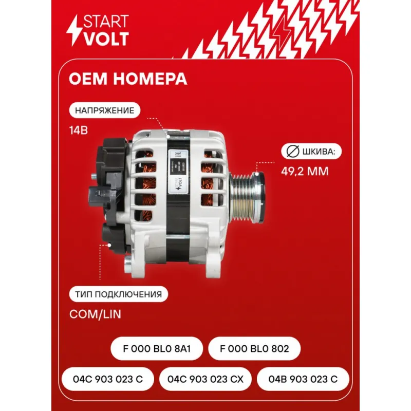 Генератор для автомобилей VAG Octavia III (13-)/Fabia III (14-)/Rapid (15-) 1.6i 140A Описание: Оригинальный генератор STARTVOLT LG 1823 рассчитан на ток 140 А и напряжение 14 В. Изготовлен аналогично оригинальной конструкции. Шкив свободного хода (6PK, диаметр 49,2 мм) полностью совместим с оригинальными агрегатами. Подходит для автомобилей: SEAT TOLEDO, IBIZA, SKODA RAPID, FABIA, OCTAVIA, SCALA, YETI, KAROQ, KAMIQ, VW CADDY, GOLF, POLO, TAOS / THARU.. Если у вас есть вопросы по применяемости, мы всегда готовы помочь вам с подбором по VIN-НОМЕРУ ВАШЕГО АВТОМОБИЛЯ. Преимущества: - Полностью соответствует оригинальным узлам; - Высокоточная сборка с пооперационным контролем качества; - Каждый генератор проходит стендовое тестирование — протокол в комплекте; - Надёжность в любых условиях эксплуатации; - STARTVOLT 15 лет на рынке автоэлектрики — нам доверяют профессионалы; - Гарантия 2 года; - Сертифицирован по стандарту EAC (ЕАЭС) — соответствует требованиям безопасности и качества; Автомобильный генератор в сборе — готов к установке. Отличный выбор для надежной замены штатного генератора. Характеристики: Артикул: LG 1823 OEM номера: 04C 903 023 C, 04C 903 023 CX, 04B 903 023 C, F 000 BL0 8A1, F 000 BL0 802 IDE код: 24 Скорость сигнала: H Напряжение, В: 14 Выходной ток, А: 140 Тип подключения: COM/LIN Диаметр шкива, мм: 49,2 Ременной шкив: с ременным шкивом свободного хода Количество крепежных отверстий: 2 Количество канавок шкива: 6 Направление вращения: По часовой стрелке Вылет шкива, мм: 30,2 Сопутствующий товар: Шкивы генераторов с обгонной муфтой: SGP 1814 Подходит для авто: Skoda Octavia A7 (13-), Rapid (12-) Для проверки применяемости отправьте VIN автомобиля через вкладку "Есть вопросы о товаре?" Комплектация: Генератор - 1 шт Индивидуальный технический паспорт изделия (с фирменным ID) - 1 шт Паспорт изделия/гарантийный талон - 1 шт Гарантия: от 1 года.
