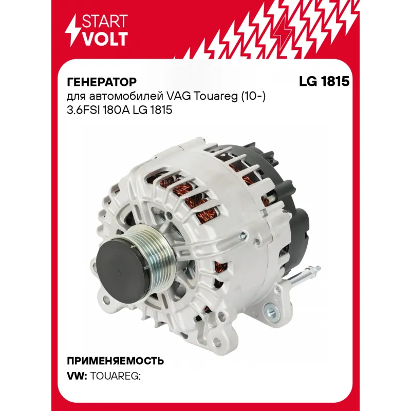 Генератор для автомобилей VAG Touareg (10-) 3.6FSI 180A Описание: Оригинальный генератор STARTVOLT LG 1815 рассчитан на ток 180 А и напряжение 14 В. Изготовлен аналогично оригинальной конструкции. Шкив свободного хода (7PK, диаметр 56 мм) полностью совместим с оригинальными агрегатами. Подходит для автомобилей: VW TOUAREG.. Если у вас есть вопросы по применяемости, мы всегда готовы помочь вам с подбором по VIN-НОМЕРУ ВАШЕГО АВТОМОБИЛЯ. Преимущества: - Полностью соответствует оригинальным узлам; - Высокоточная сборка с пооперационным контролем качества; - Каждый генератор проходит стендовое тестирование — протокол в комплекте; - Надёжность в любых условиях эксплуатации; - STARTVOLT 15 лет на рынке автоэлектрики — нам доверяют профессионалы; - Гарантия 2 года; - Сертифицирован по стандарту EAC (ЕАЭС) — соответствует требованиям безопасности и качества; Автомобильный генератор в сборе — готов к установке. Отличный выбор для надежной замены штатного генератора. Характеристики: Артикул: LG 1815 OEM номера: 03H903023C, 03H903023CX, 3H903023C, 3H903023CX, 439735, FG18T070 Направление вращения: По часовой стрелке Выходной ток, А: 180 Напряжение, В: 14 Вылет шкива, мм: 30 Тип подключения: COM/LIN Диаметр шкива, мм: 56 Ременной шкив: с ременным шкивом свободного хода Количество крепежных отверстий: 2 Количество канавок шкива: 7 IDE код: 41 Скорость сигнала: MH Комплектация: Генератор - 1 шт Индивидуальный технический паспорт изделия (с фирменным ID) - 1 шт Паспорт изделия/гарантийный талон - 1 шт Гарантия: от 1 года.