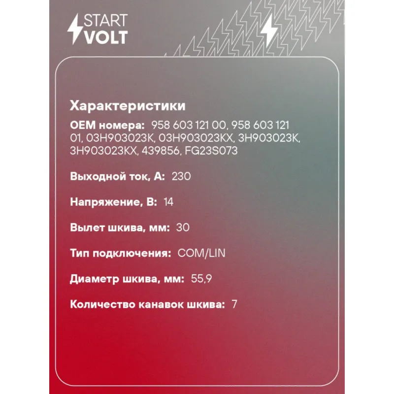 Генератор для автомобилей VAG Touareg (10-)/Cayenne (10-) 3.6FSI 230A Характеристики: Артикул: LG 1841 OEM номера: 958 603 121 00, 958 603 121 01, 03H903023K, 03H903023KX, 3H903023K, 3H903023KX, 439856, FG23S073 Направление вращения: по часовой стрелке Выходной ток, А: 230 Напряжение, В: 14 Вылет шкива, мм: 30 Тип подключения: COM/LIN Диаметр шкива, мм: 55,9 Ременной шкив: с ременным шкивом свободного хода Количество крепежных отверстий: 2 Количество канавок шкива: 7 IDE код: 57 Скорость сигнала: LMH Комплектация: Генератор - 1 шт Индивидуальный технический паспорт изделия (с фирменным ID) - 1 шт Паспорт изделия/гарантийный талон - 1 шт Гарантия: от 1 года.
