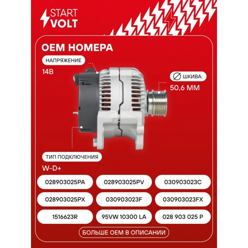 Генератор для автомобилей VAG Transporter T4 (90-) 1.9D/Passat B3/B4 (88-) 1.8i 90A Описание: Оригинальный генератор STARTVOLT LG 1840 рассчитан на ток 90 А и напряжение 14 В. Изготовлен аналогично оригинальной конструкции. с многоручейковым ручейковым шкивом шкив (6PK, диаметр 50,6 мм) полностью совместим с оригинальными агрегатами. Подходит для автомобилей: SEAT TOLEDO, INCA, IBIZA, CORDOBA, AROSA, ALHAMBRA, VW CADDY, GOLF, PASSAT, VENTO, T4, SHARAN, POLO, CORRADO.. Если у вас есть вопросы по применяемости, мы всегда готовы помочь вам с подбором по VIN-НОМЕРУ ВАШЕГО АВТОМОБИЛЯ. Преимущества: - Полностью соответствует оригинальным узлам; - Высокоточная сборка с пооперационным контролем качества; - Каждый генератор проходит стендовое тестирование — протокол в комплекте; - Надёжность в любых условиях эксплуатации; - STARTVOLT 15 лет на рынке автоэлектрики — нам доверяют профессионалы; - Гарантия 2 года; - Сертифицирован по стандарту EAC (ЕАЭС) — соответствует требованиям безопасности и качества; Автомобильный генератор в сборе — готов к установке. Отличный выбор для надежной замены штатного генератора. Характеристики: Артикул: LG 1840 OEM номера: 1516623R, 95VW 10300 LA, 028 903 025 P, 028903025PX, 030903023F, 030903023FX, 028903025PA, 028903025PV, 030903023C, 0 123 320 002 Напряжение, В: 14 Выходной ток, А: 90 Тип подключения: W-D+ Диаметр шкива, мм: 50,6 Ременной шкив: с многоручейковым ручейковым шкивом Количество крепежных отверстий: 3 Количество канавок шкива: 6 Направление вращения: По часовой стрелке Вылет шкива, мм: 40,7 Подходит для авто: Volkswagen Caddy (96-), Golf III (91-), Passat B3 (88-), Golf IV (97-), Transporter T4 (90-) Для проверки применяемости отправьте VIN автомобиля через вкладку "Есть вопросы о товаре?" Комплектация: Индивидуальный технический паспорт изделия (с фирменным ID) - 1 шт Паспорт изделия/гарантийный талон - 1 шт Генератор - 1 шт Гарантия: от 1 года.