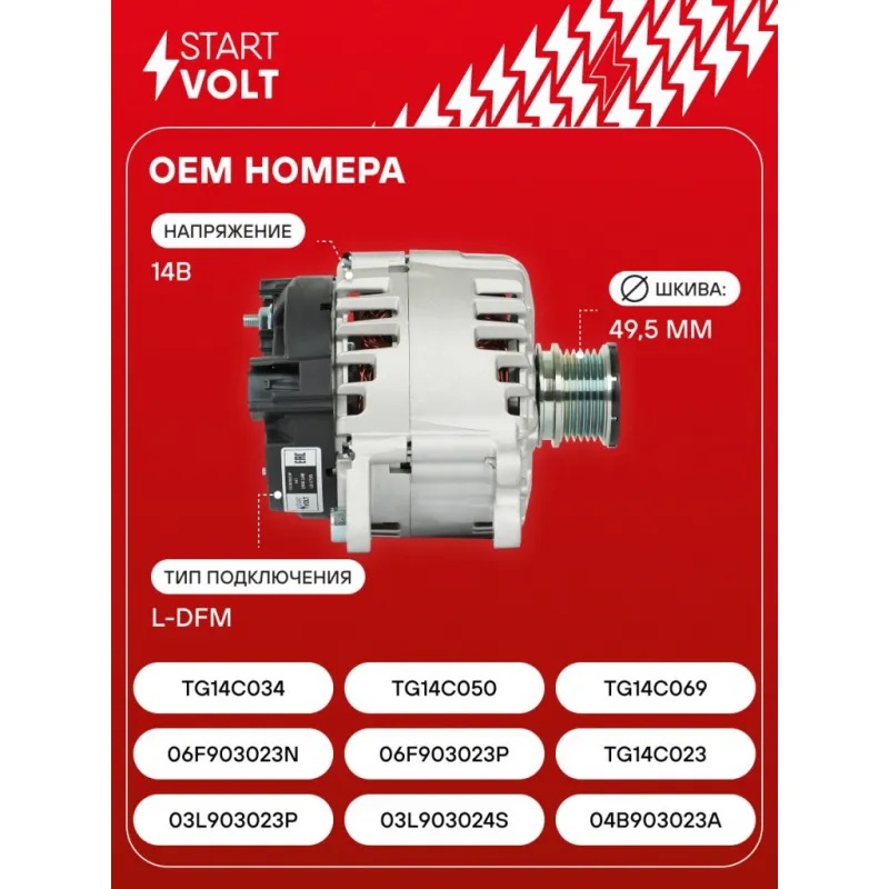 Генератор для автомобилей VAG Transporter T5 (03-)/Amarok (10-) 2.0TDI 140A Описание: Оригинальный генератор STARTVOLT LG 1729 рассчитан на ток 140 А и напряжение 14 В. Изготовлен аналогично оригинальной конструкции. Шкив свободного хода (6PK, диаметр 49,5 мм) полностью совместим с оригинальными агрегатами. Подходит для автомобилей: AUDI TT, SEAT EXEO, SKODA SUPERB, VW T5, PASSAT, CRAFTER, T6, AMAROK.. Если у вас есть вопросы по применяемости, мы всегда готовы помочь вам с подбором по VIN-НОМЕРУ ВАШЕГО АВТОМОБИЛЯ. Преимущества: - Полностью соответствует оригинальным узлам; - Высокоточная сборка с пооперационным контролем качества; - Каждый генератор проходит стендовое тестирование — протокол в комплекте; - Надёжность в любых условиях эксплуатации; - STARTVOLT 15 лет на рынке автоэлектрики — нам доверяют профессионалы; - Гарантия 2 года; - Сертифицирован по стандарту EAC (ЕАЭС) — соответствует требованиям безопасности и качества; Автомобильный генератор в сборе — готов к установке. Отличный выбор для надежной замены штатного генератора. Характеристики: Артикул: LG 1729 OEM номера: 03L903023P, 03L903024S, 04B903023A, 06F903023N, 06F903023P, TG14C023, TG14C034, TG14C050, TG14C069 Направление вращения: По часовой стрелке Выходной ток, А: 140 Напряжение, В: 14 Вылет шкива, мм: 39,5 Тип подключения: L-DFM Диаметр шкива, мм: 49,5 Ременной шкив: с ременным шкивом свободного хода Количество крепежных отверстий: 2 Количество канавок шкива: 6 Комплектация: Генератор - 1 шт Индивидуальный технический паспорт изделия (с фирменным ID) - 1 шт Паспорт изделия/гарантийный талон - 1 шт Гарантия: от 1 года.