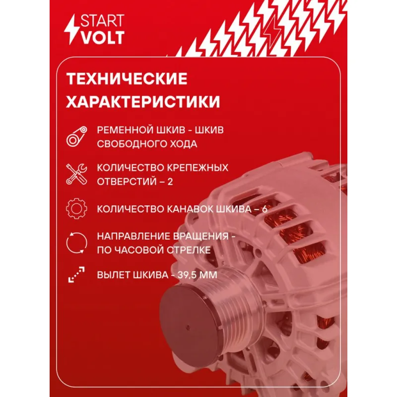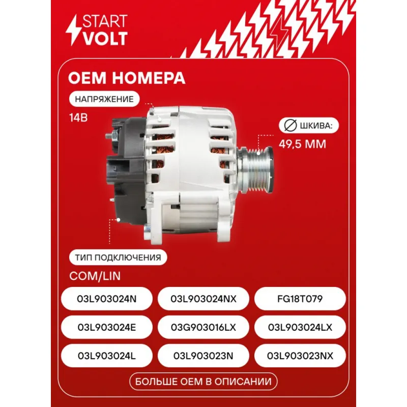 Генератор для автомобилей VAG Transporter T5 (03-)/Tiguan (16-) 2.0TDI 180A Описание: Оригинальный генератор STARTVOLT LG 1816 рассчитан на ток 180 А и напряжение 14 В. Изготовлен аналогично оригинальной конструкции. Шкив свободного хода (6PK, диаметр 49,5 мм) полностью совместим с оригинальными агрегатами. Подходит для автомобилей: AUDI A3, MAN TGE, SEAT ATECA, ALHAMBRA, SKODA SUPERB, OCTAVIA, KODIAQ, VW T6, T5, TOURAN, TIGUAN, TERAMONT / ATLAS, SHARAN, PASSAT, GOLF, CRAFTER, CC, CADDY, ARTEON.. Если у вас есть вопросы по применяемости, мы всегда готовы помочь вам с подбором по VIN-НОМЕРУ ВАШЕГО АВТОМОБИЛЯ. Преимущества: - Полностью соответствует оригинальным узлам; - Высокоточная сборка с пооперационным контролем качества; - Каждый генератор проходит стендовое тестирование — протокол в комплекте; - Надёжность в любых условиях эксплуатации; - STARTVOLT 15 лет на рынке автоэлектрики — нам доверяют профессионалы; - Гарантия 2 года; - Сертифицирован по стандарту EAC (ЕАЭС) — соответствует требованиям безопасности и качества; Автомобильный генератор в сборе — готов к установке. Отличный выбор для надежной замены штатного генератора. Характеристики: Артикул: LG 1816 OEM номера: 03L903024L, 03L903023N, 03L903023NX, 03L903024E, 03G903016LX, 03L903024LX, 03L903024N, 03L903024NX, FG18T079, FG18T103, FG18T123, FG18T124 Направление вращения: По часовой стрелке Выходной ток, А: 180 Напряжение, В: 14 Вылет шкива, мм: 39,5 Тип подключения: COM/LIN Диаметр шкива, мм: 49,5 Ременной шкив: с ременным шкивом свободного хода Количество крепежных отверстий: 2 Количество канавок шкива: 6 IDE код: 73 Скорость сигнала: LMH Комплектация: Генератор - 1 шт Индивидуальный технический паспорт изделия (с фирменным ID) - 1 шт Паспорт изделия/гарантийный талон - 1 шт Гарантия: от 1 года.