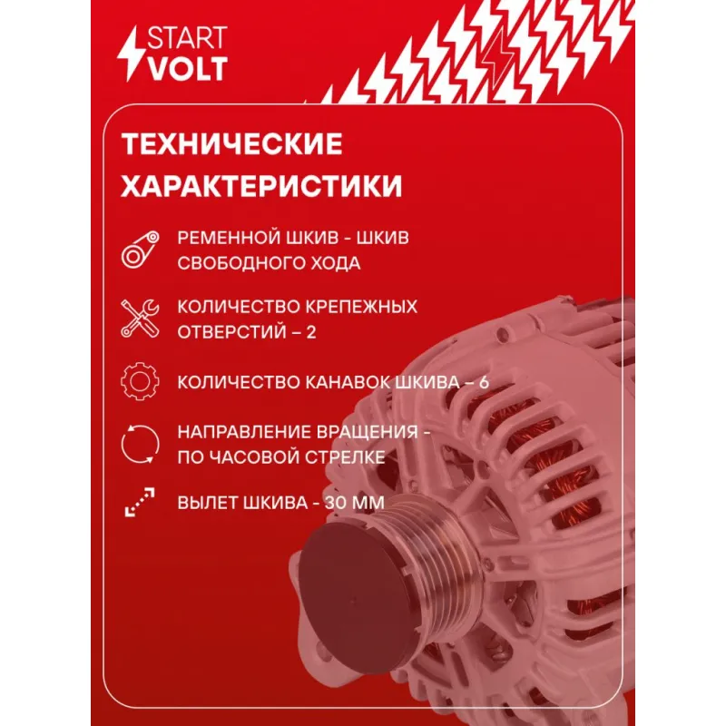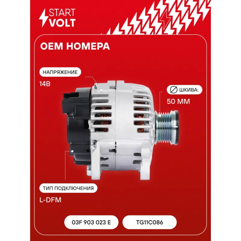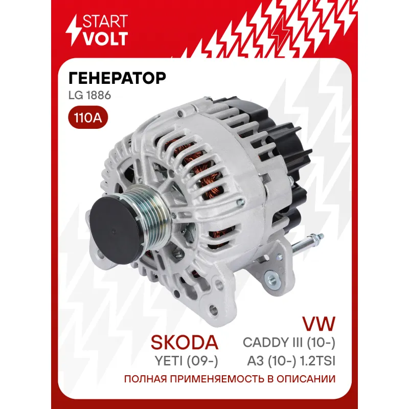 Генератор для автомобилей VAG Yeti (09-)/Caddy III (10-)/A3 (10-) 1.2TSI 110A Описание: Оригинальный генератор STARTVOLT LG 1886 рассчитан на ток 110 А и напряжение 14 В. Изготовлен аналогично оригинальной конструкции. Шкив свободного хода (6PK, диаметр 50 мм) полностью совместим с оригинальными агрегатами. Подходит для автомобилей: AUDI A1, A3, SEAT TOLEDO, LEON, IBIZA, ALTEA, SKODA YETI, ROOMSTER, RAPID, OCTAVIA, FABIA, VW POLO, JETTA, GOLF, GOLF PLUS, CADDY, BEETLE.. Если у вас есть вопросы по применяемости, мы всегда готовы помочь вам с подбором по VIN-НОМЕРУ ВАШЕГО АВТОМОБИЛЯ. Преимущества: - Полностью соответствует оригинальным узлам; - Высокоточная сборка с пооперационным контролем качества; - Каждый генератор проходит стендовое тестирование — протокол в комплекте; - Надёжность в любых условиях эксплуатации; - STARTVOLT 15 лет на рынке автоэлектрики — нам доверяют профессионалы; - Гарантия 2 года; - Сертифицирован по стандарту EAC (ЕАЭС) — соответствует требованиям безопасности и качества; Автомобильный генератор в сборе — готов к установке. Отличный выбор для надежной замены штатного генератора. Характеристики: Артикул: LG 1886 OEM номера: 03F 903 023 E, TG11C086 Направление вращения: По часовой стрелке Выходной ток, А: 110 Напряжение, В: 14 Вылет шкива, мм: 30 Тип подключения: L-DFM Диаметр шкива, мм: 50 Ременной шкив: с ременным шкивом свободного хода Количество крепежных отверстий: 2 Количество канавок шкива: 6 Комплектация: Индивидуальный технический паспорт изделия (с фирменным ID) - 1 шт Генератор - 1 шт Паспорт изделия/гарантийный талон - 1 шт Гарантия: от 1 года.