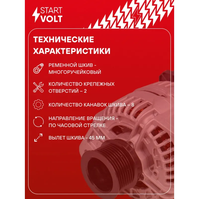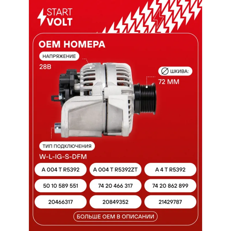 Генератор для автомобилей Volvo FH (05-)/FM (05-) с дв. D13A400/D13A440 110A Описание: Оригинальный генератор STARTVOLT LG 1056 рассчитан на ток 110 А и напряжение 28 В. Изготовлен аналогично оригинальной конструкции. с многоручейковым ручейковым шкивом шкив (8PK, диаметр 72 мм) полностью совместим с оригинальными агрегатами. Подходит для автомобилей: RENAULT TRUCKS MAGNUM, KERAX, VOLVO FH, FM.. Если у вас есть вопросы по применяемости, мы всегда готовы помочь вам с подбором по VIN-НОМЕРУ ВАШЕГО АВТОМОБИЛЯ. Преимущества: - Полностью соответствует оригинальным узлам; - Высокоточная сборка с пооперационным контролем качества; - Каждый генератор проходит стендовое тестирование — протокол в комплекте; - Надёжность в любых условиях эксплуатации; - STARTVOLT 15 лет на рынке автоэлектрики — нам доверяют профессионалы; - Гарантия 2 года; - Сертифицирован по стандарту EAC (ЕАЭС) — соответствует требованиям безопасности и качества; Автомобильный генератор в сборе — готов к установке. Отличный выбор для надежной замены штатного генератора. Характеристики: Артикул: LG 1056 OEM номера: 20466317, 20849352, 21429787, 50 10 589 551, 74 20 466 317, 74 20 862 899, A 004 T R5392, A 004 T R5392ZT, A 4 T R5392, A 4 T R5392ZT, 0 986 049 350, 85020824, 85020819, 85000419, 85000628, 85000626, 85000644, 85000257, 85003357, 85000461, 20466316, 21524615, 21429788, 7421429789, 7485003361, 5001868213, 74 20 842 441, 7420842445, 20739778, 21812800, A 004 T R5391, A 004 T R5391ZT, A 004 T R5591, A 004 T R5591ZT, A 4 T R5391, A 4 T R5391ZT, A 4 T R5591, A 4 T R5591ZT, A004TR5592ZT, 0 124 655 173, 5001867214 Напряжение, В: 28 Выходной ток, А: 110 Тип подключения: W-L-IG-S-DFM Диаметр шкива, мм: 72 Ременной шкив: с многоручейковым ручейковым шкивом Количество крепежных отверстий: 2 Количество канавок шкива: 8 Направление вращения: По часовой стрелке Вылет шкива, мм: 45 Подходит для авто: Volvo FH12 (05-) Для проверки применяемости отправьте VIN автомобиля через вкладку "Есть вопросы о товаре?" Комплектация: Индивидуальный технический паспорт изделия (с фирменным ID) - 1 шт Генератор - 1 шт Паспорт изделия/гарантийный талон - 1 шт Гарантия: от 1 года.