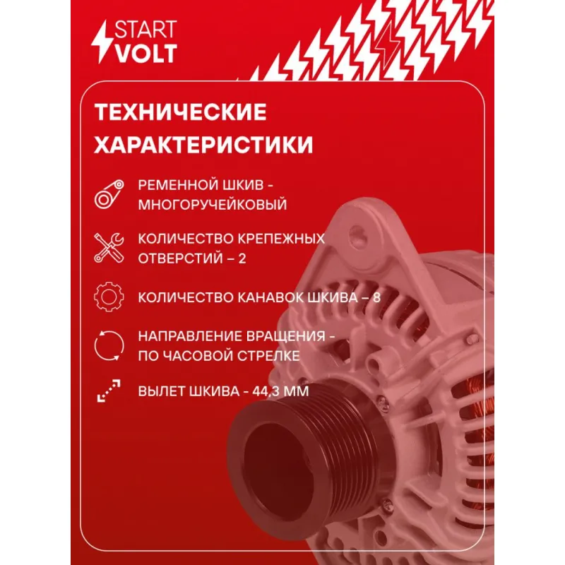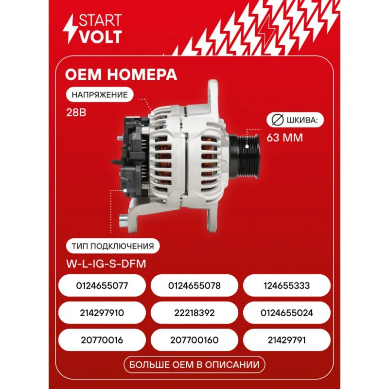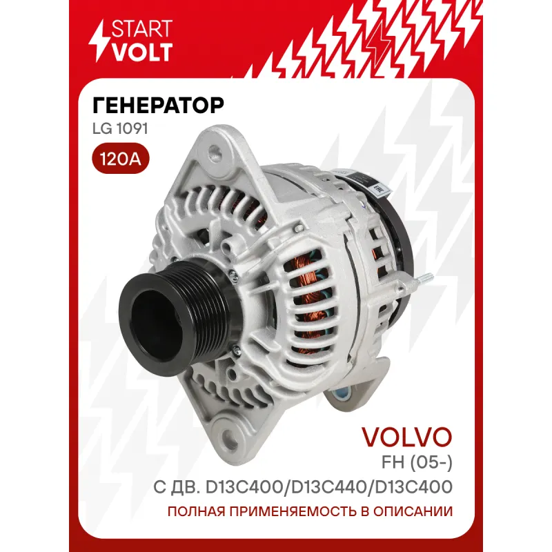 Генератор для автомобилей Volvo FH (05-) с дв. D13C400/D13C440/D13C400 120A Описание: Оригинальный генератор STARTVOLT LG 1091 рассчитан на ток 120 А и напряжение 28 В. Изготовлен аналогично оригинальной конструкции. с многоручейковым ручейковым шкивом шкив (8PK, диаметр 63 мм) полностью совместим с оригинальными агрегатами. Подходит для автомобилей: VOLVO FH, 9900, 9700, B.. Если у вас есть вопросы по применяемости, мы всегда готовы помочь вам с подбором по VIN-НОМЕРУ ВАШЕГО АВТОМОБИЛЯ. Преимущества: - Полностью соответствует оригинальным узлам; - Высокоточная сборка с пооперационным контролем качества; - Каждый генератор проходит стендовое тестирование — протокол в комплекте; - Надёжность в любых условиях эксплуатации; - STARTVOLT 15 лет на рынке автоэлектрики — нам доверяют профессионалы; - Гарантия 2 года; - Сертифицирован по стандарту EAC (ЕАЭС) — соответствует требованиям безопасности и качества; Автомобильный генератор в сборе — готов к установке. Отличный выбор для надежной замены штатного генератора. Характеристики: Артикул: LG 1091 OEM номера: 20770016, 207700160, 21429791, 214297910, 22218392, 0124655024, 0124655077, 0124655078, 0124655333, 0124655429 Направление вращения: По часовой стрелке Выходной ток, А: 120 Напряжение, В: 28 Вылет шкива, мм: 44,3 Тип подключения: W-L-IG-S-DFM Диаметр шкива, мм: 63 Ременной шкив: с многоручейковым ручейковым шкивом Количество крепежных отверстий: 2 Количество канавок шкива: 8 Комплектация: Паспорт изделия/гарантийный талон - 1 шт Генератор - 1 шт Индивидуальный технический паспорт изделия (с фирменным ID) - 1 шт Гарантия: от 1 года.