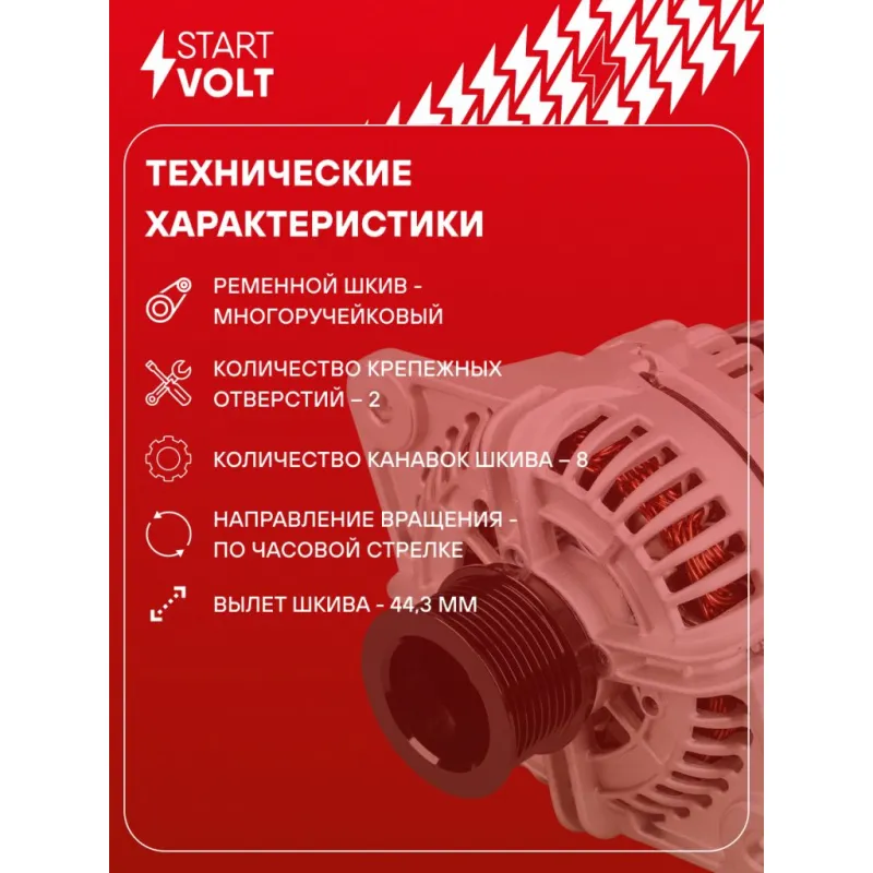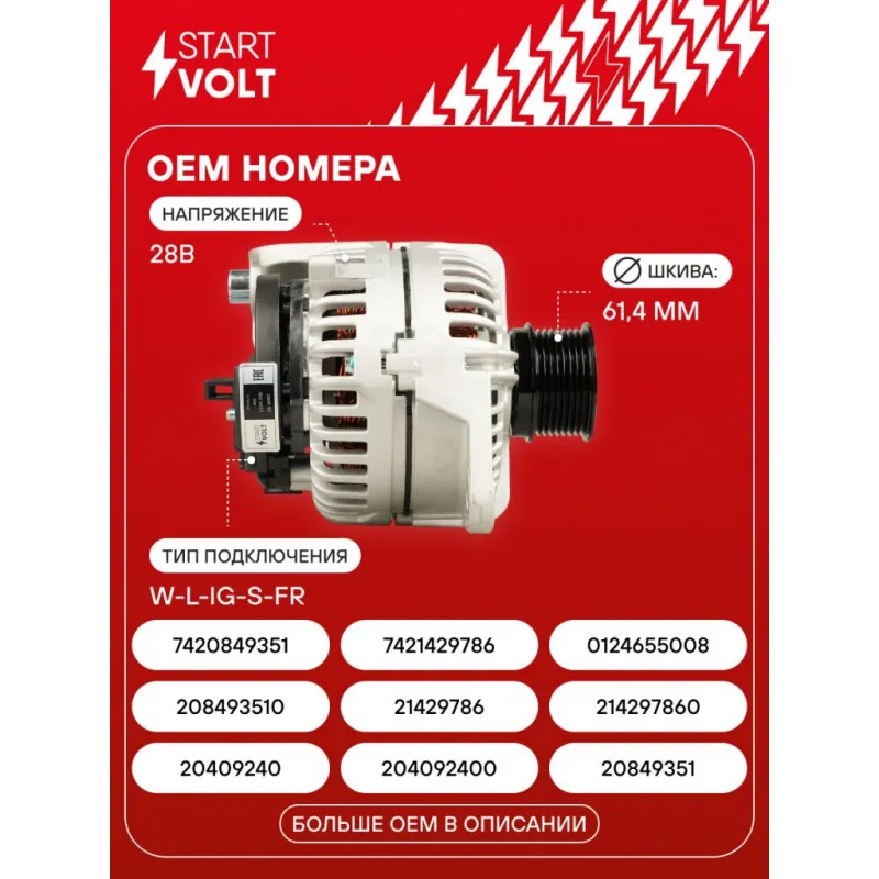 Генератор для автомобилей Volvo FH12 (93-) с дв. D12A380/D12A420/FH (05-) с дв. D13A400/D13A440 110A Описание: Оригинальный генератор STARTVOLT LG 1092 рассчитан на ток 110 А и напряжение 28 В. Изготовлен аналогично оригинальной конструкции. с многоручейковым ручейковым шкивом шкив (8PK, диаметр 61,4 мм) полностью совместим с оригинальными агрегатами. Подходит для автомобилей: VOLVO FH, FM, B, 9700, 9900, 8700.. Если у вас есть вопросы по применяемости, мы всегда готовы помочь вам с подбором по VIN-НОМЕРУ ВАШЕГО АВТОМОБИЛЯ. Преимущества: - Полностью соответствует оригинальным узлам; - Высокоточная сборка с пооперационным контролем качества; - Каждый генератор проходит стендовое тестирование — протокол в комплекте; - Надёжность в любых условиях эксплуатации; - STARTVOLT 15 лет на рынке автоэлектрики — нам доверяют профессионалы; - Гарантия 2 года; - Сертифицирован по стандарту EAC (ЕАЭС) — соответствует требованиям безопасности и качества; Автомобильный генератор в сборе — готов к установке. Отличный выбор для надежной замены штатного генератора. Характеристики: Артикул: LG 1092 OEM номера: 0910378, 20409240, 204092400, 20849351, 208493510, 21429786, 214297860, 0124655008, 0124655012, 0124655013, 0124655019, 0124655092, 0124655103, 0124655499, 0124655500, 0124655505, 7420849351, 7421429786 Направление вращения: По часовой стрелке Выходной ток, А: 110 Напряжение, В: 28 Вылет шкива, мм: 44,3 Тип подключения: W-L-IG-S-FR Диаметр шкива, мм: 61,4 Ременной шкив: с многоручейковым ручейковым шкивом Количество крепежных отверстий: 2 Количество канавок шкива: 8 Комплектация: Паспорт изделия/гарантийный талон - 1 шт Индивидуальный технический паспорт изделия (с фирменным ID) - 1 шт Генератор - 1 шт Гарантия: от 1 года.