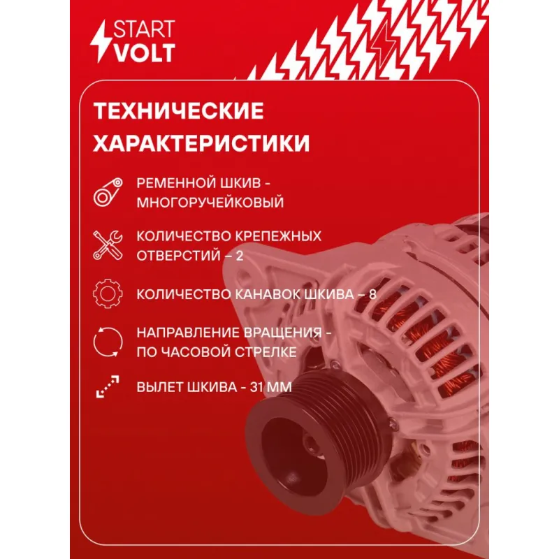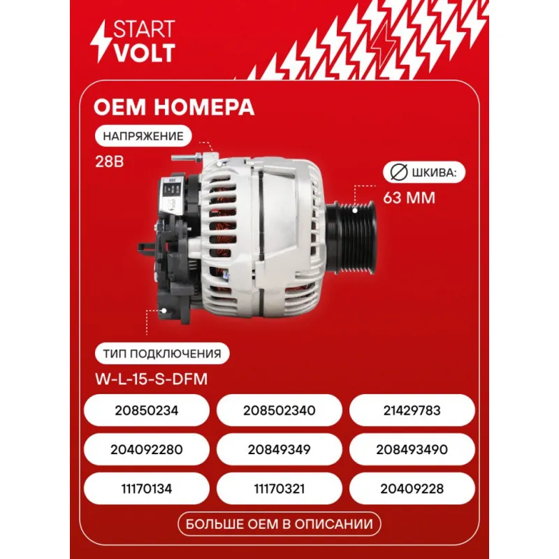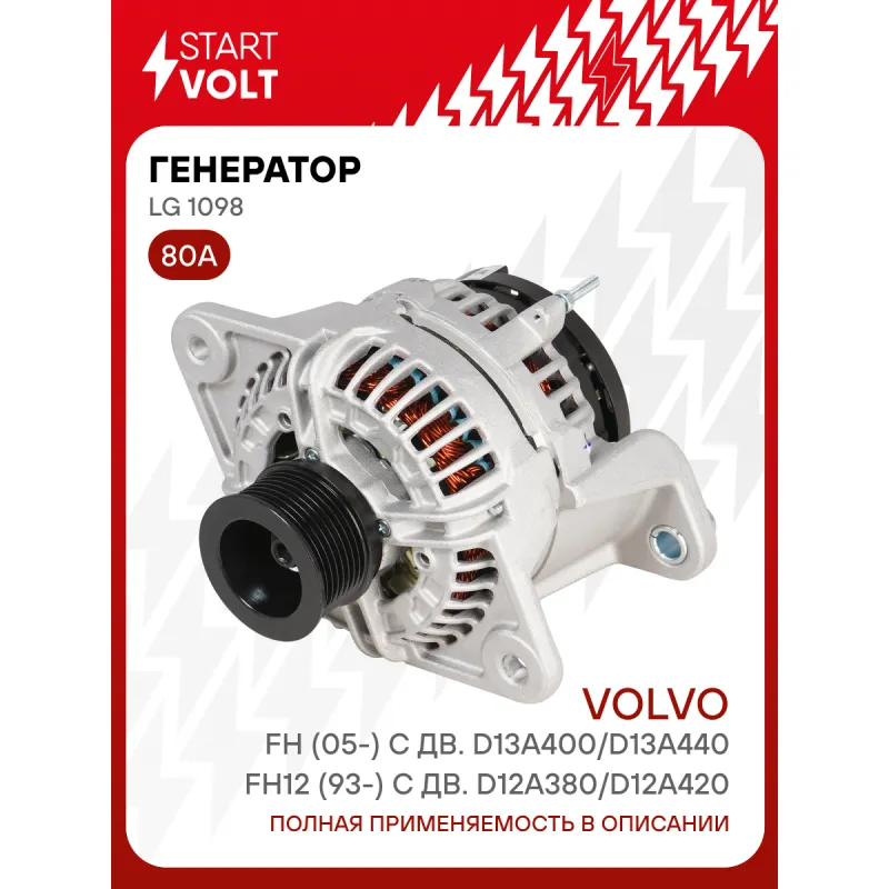 Генератор для автомобилей Volvo FH12 (93-) с дв. D12A380/D12A420/FH (05-) с дв. D13A400/D13A440 80A Описание: Оригинальный генератор STARTVOLT LG 1098 рассчитан на ток 80 А и напряжение 28 В. Изготовлен аналогично оригинальной конструкции. с многоручейковым ручейковым шкивом шкив (8PK, диаметр 63 мм) полностью совместим с оригинальными агрегатами. Подходит для автомобилей: RENAULT TRUCKS MAGNUM, VOLVO FH, FM, B, 9700, 9900, 7700, 8700.. Если у вас есть вопросы по применяемости, мы всегда готовы помочь вам с подбором по VIN-НОМЕРУ ВАШЕГО АВТОМОБИЛЯ. Преимущества: - Полностью соответствует оригинальным узлам; - Высокоточная сборка с пооперационным контролем качества; - Каждый генератор проходит стендовое тестирование — протокол в комплекте; - Надёжность в любых условиях эксплуатации; - STARTVOLT 15 лет на рынке автоэлектрики — нам доверяют профессионалы; - Гарантия 2 года; - Сертифицирован по стандарту EAC (ЕАЭС) — соответствует требованиям безопасности и качества; Автомобильный генератор в сборе — готов к установке. Отличный выбор для надежной замены штатного генератора. Характеристики: Артикул: LG 1098 OEM номера: 11170134, 11170321, 20409228, 204092280, 20849349, 208493490, 20850234, 208502340, 21429783, 214297830, 21429785, 214297850, 50 10 589 525, 5001866291, 74 20 409 228, 74 20 853 850, 0124555020, 0124555023, 0124555058 Напряжение, В: 28 Выходной ток, А: 80 Тип подключения: W-L-15-S-DFM Диаметр шкива, мм: 63 Ременной шкив: с многоручейковым ручейковым шкивом Количество крепежных отверстий: 2 Количество канавок шкива: 8 Направление вращения: По часовой стрелке Вылет шкива, мм: 31 Комплектация: Паспорт изделия/гарантийный талон - 1 шт Генератор - 1 шт Индивидуальный технический паспорт изделия (с фирменным ID) - 1 шт Гарантия: от 1 года.