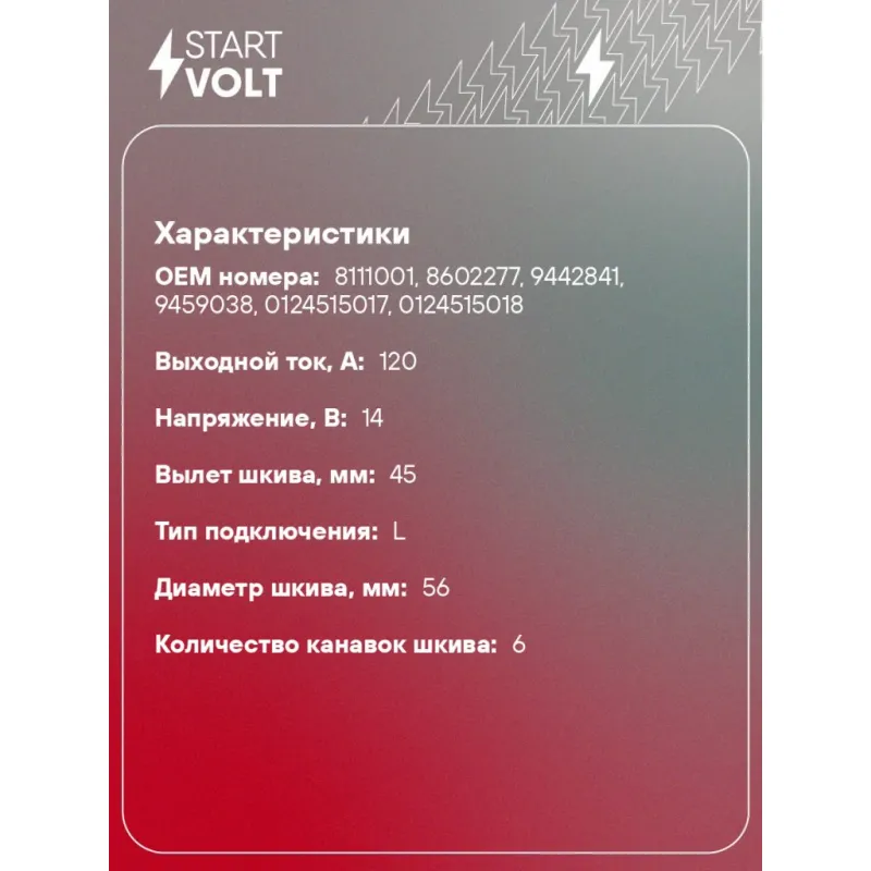 Генератор для автомобилей Volvo S60 I (00-)/S80 I (99-)/XC70 I (00-) 2.4T/2.5T 120A Описание: Оригинальный генератор STARTVOLT LG 1024 рассчитан на ток 120 А и напряжение 14 В. Изготовлен аналогично оригинальной конструкции. с многоручейковым ручейковым шкивом шкив (6PK, диаметр 56 мм) полностью совместим с оригинальными агрегатами. Подходит для автомобилей: VOLVO S60, S80, V70, XC70.. Если у вас есть вопросы по применяемости, мы всегда готовы помочь вам с подбором по VIN-НОМЕРУ ВАШЕГО АВТОМОБИЛЯ. Преимущества: - Полностью соответствует оригинальным узлам; - Высокоточная сборка с пооперационным контролем качества; - Каждый генератор проходит стендовое тестирование — протокол в комплекте; - Надёжность в любых условиях эксплуатации; - STARTVOLT 15 лет на рынке автоэлектрики — нам доверяют профессионалы; - Гарантия 2 года; - Сертифицирован по стандарту EAC (ЕАЭС) — соответствует требованиям безопасности и качества; Автомобильный генератор в сборе — готов к установке. Отличный выбор для надежной замены штатного генератора. Характеристики: Артикул: LG 1024 OEM номера: 8111001, 8602277, 9442841, 9459038, 0124515017, 0124515018 Направление вращения: Против часовой стрелки Выходной ток, А: 120 Напряжение, В: 14 Вылет шкива, мм: 45 Тип подключения: L Диаметр шкива, мм: 56 Ременной шкив: с многоручейковым ручейковым шкивом Количество крепежных отверстий: 2 Количество канавок шкива: 6 Комплектация: Паспорт изделия/гарантийный талон - 1 шт Индивидуальный технический паспорт изделия (с фирменным ID) - 1 шт Генератор - 1 шт Гарантия: от 1 года.
