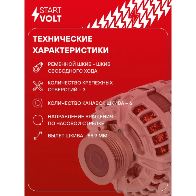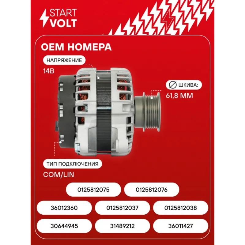 Генератор для автомобилей Volvo XC60 II (17-)/XC90 II (15-) 2.0T 215A Описание: Оригинальный генератор STARTVOLT LG 1026 рассчитан на ток 215 А и напряжение 14 В. Изготовлен аналогично оригинальной конструкции. Шкив свободного хода (6PK, диаметр 61,8 мм) полностью совместим с оригинальными агрегатами. Подходит для автомобилей: VOLVO S60, S80, S90, V40, V60, V70, V90, XC40, XC60, XC70, XC90.. Если у вас есть вопросы по применяемости, мы всегда готовы помочь вам с подбором по VIN-НОМЕРУ ВАШЕГО АВТОМОБИЛЯ. Преимущества: - Полностью соответствует оригинальным узлам; - Высокоточная сборка с пооперационным контролем качества; - Каждый генератор проходит стендовое тестирование — протокол в комплекте; - Надёжность в любых условиях эксплуатации; - STARTVOLT 15 лет на рынке автоэлектрики — нам доверяют профессионалы; - Гарантия 2 года; - Сертифицирован по стандарту EAC (ЕАЭС) — соответствует требованиям безопасности и качества; Автомобильный генератор в сборе — готов к установке. Отличный выбор для надежной замены штатного генератора. Характеристики: Артикул: LG 1026 OEM номера: 30644945, 31489212, 36011427, 36012360, 0125812037, 0125812038, 0125812075, 0125812076 Направление вращения: По часовой стрелке Выходной ток, А: 215 Напряжение, В: 14 Вылет шкива, мм: 55,9 Тип подключения: COM/LIN Диаметр шкива, мм: 61,8 Ременной шкив: с ременным шкивом свободного хода Количество крепежных отверстий: 3 Количество канавок шкива: 6 IDE код: 88 Скорость сигнала: H Комплектация: Паспорт изделия/гарантийный талон - 1 шт Генератор - 1 шт Индивидуальный технический паспорт изделия (с фирменным ID) - 1 шт Гарантия: от 1 года.
