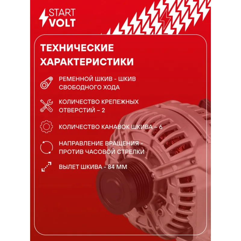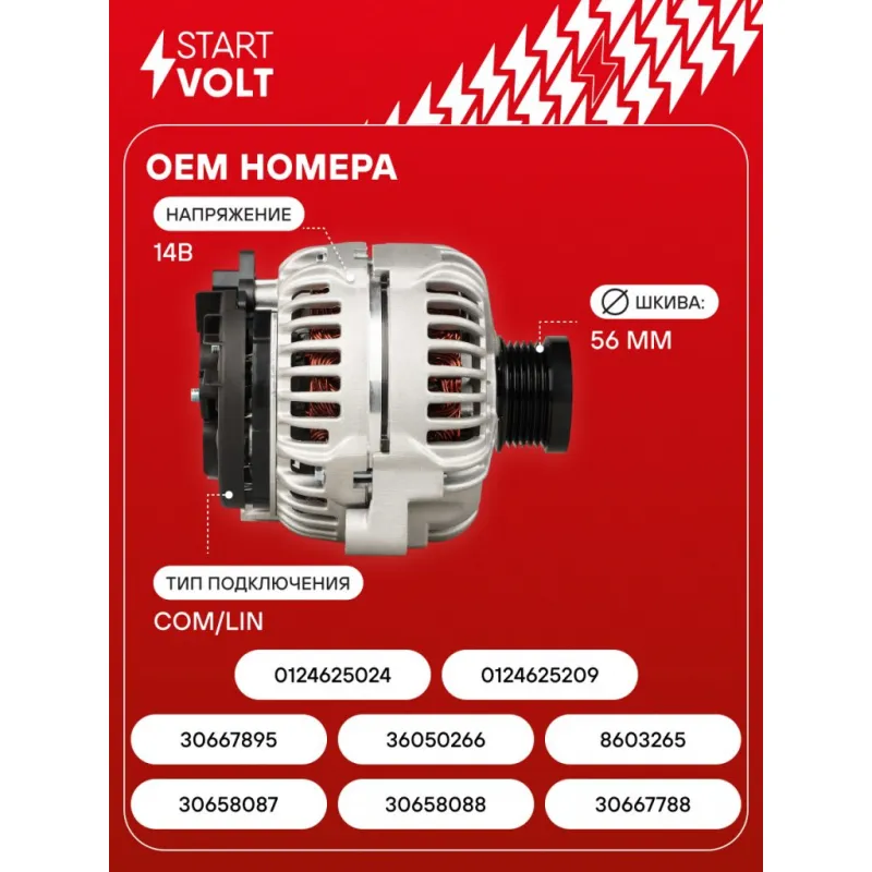 Генератор для автомобилей Volvo XC90 (02-) 2.4D/S60 (00-) 2.4i 160A Описание: Оригинальный генератор STARTVOLT LG 1013 рассчитан на ток 160 А и напряжение 14 В. Изготовлен аналогично оригинальной конструкции. Шкив свободного хода (6PK, диаметр 56 мм) полностью совместим с оригинальными агрегатами. Подходит для автомобилей: VOLVO S60, S80, V70, XC70, XC90.. Если у вас есть вопросы по применяемости, мы всегда готовы помочь вам с подбором по VIN-НОМЕРУ ВАШЕГО АВТОМОБИЛЯ. Преимущества: - Полностью соответствует оригинальным узлам; - Высокоточная сборка с пооперационным контролем качества; - Каждый генератор проходит стендовое тестирование — протокол в комплекте; - Надёжность в любых условиях эксплуатации; - STARTVOLT 15 лет на рынке автоэлектрики — нам доверяют профессионалы; - Гарантия 2 года; - Сертифицирован по стандарту EAC (ЕАЭС) — соответствует требованиям безопасности и качества; Автомобильный генератор в сборе — готов к установке. Отличный выбор для надежной замены штатного генератора. Характеристики: Артикул: LG 1013 OEM номера: 30658087, 30658088, 30667788, 30667895, 36050266, 8603265, 0124625024, 0124625209 Направление вращения: Против часовой стрелки Выходной ток, А: 160 Напряжение, В: 14 Вылет шкива, мм: 84 Тип подключения: COM/LIN Диаметр шкива, мм: 56 Ременной шкив: с ременным шкивом свободного хода Количество крепежных отверстий: 2 Количество канавок шкива: 6 IDE код: 88 Скорость сигнала: M Комплектация: Паспорт изделия/гарантийный талон - 1 шт Индивидуальный технический паспорт изделия (с фирменным ID) - 1 шт Генератор - 1 шт Гарантия: от 1 года.