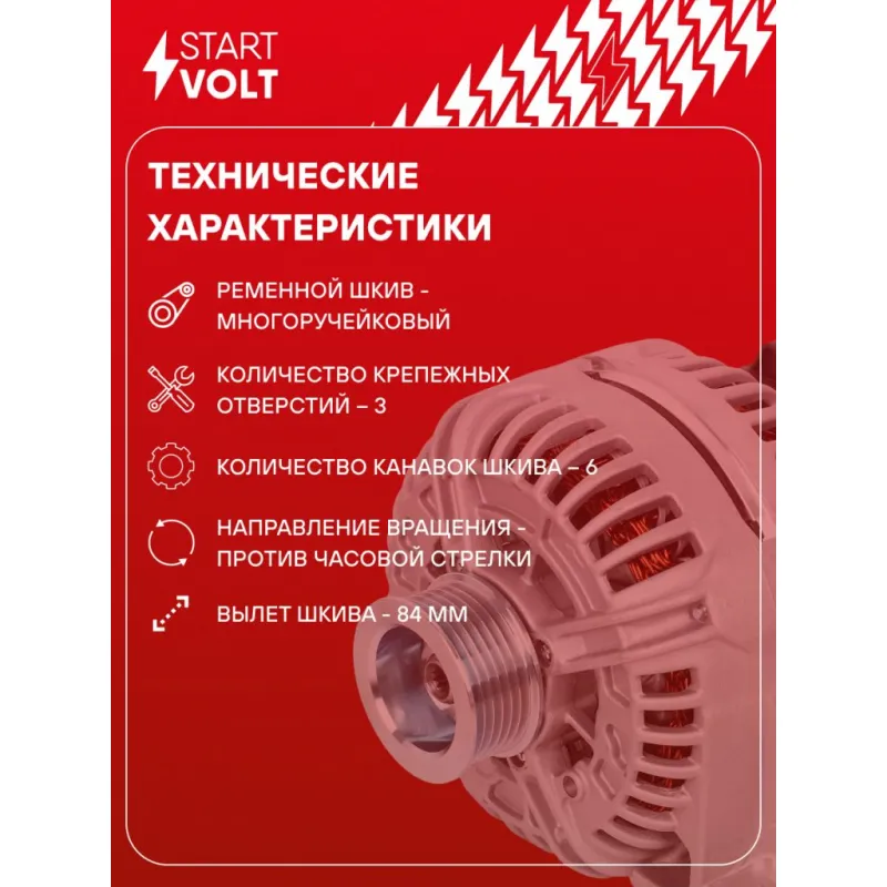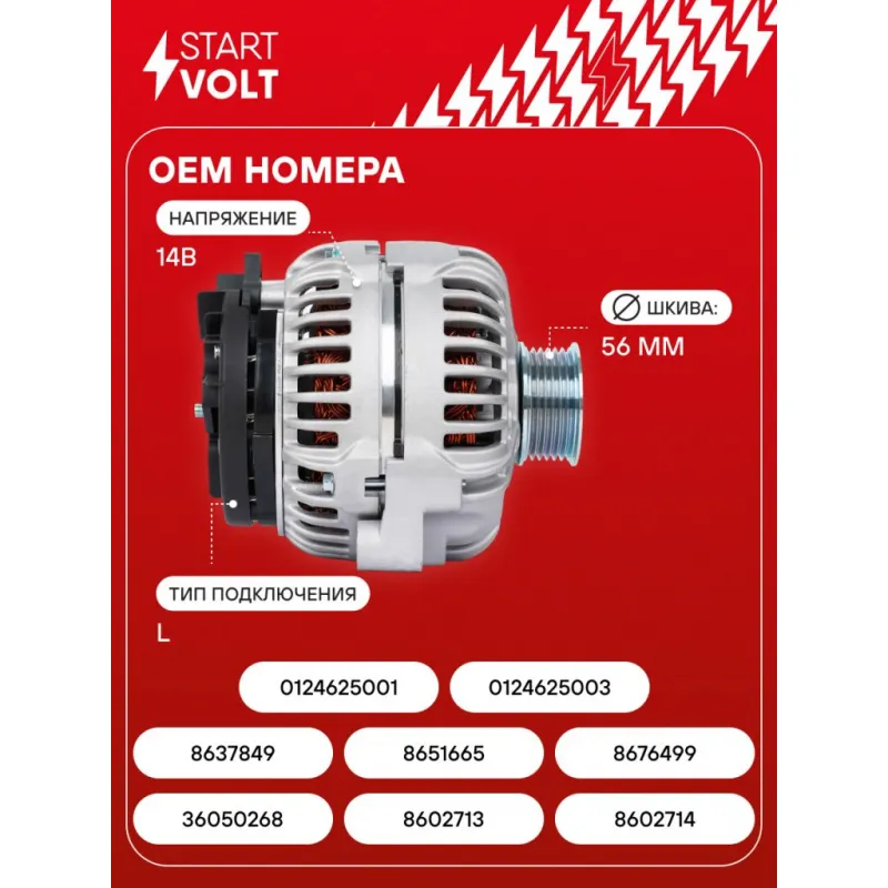 Генератор для автомобилей Volvo XC90 (02-) 2.5T/S60 (00-) 2.4i 160A Описание: Оригинальный генератор STARTVOLT LG 1012 рассчитан на ток 160 А и напряжение 14 В. Изготовлен аналогично оригинальной конструкции. с многоручейковым ручейковым шкивом шкив (6PK, диаметр 56 мм) полностью совместим с оригинальными агрегатами. Подходит для автомобилей: VOLVO S60, S80, V70, XC70, XC90.. Если у вас есть вопросы по применяемости, мы всегда готовы помочь вам с подбором по VIN-НОМЕРУ ВАШЕГО АВТОМОБИЛЯ. Преимущества: - Полностью соответствует оригинальным узлам; - Высокоточная сборка с пооперационным контролем качества; - Каждый генератор проходит стендовое тестирование — протокол в комплекте; - Надёжность в любых условиях эксплуатации; - STARTVOLT 15 лет на рынке автоэлектрики — нам доверяют профессионалы; - Гарантия 2 года; - Сертифицирован по стандарту EAC (ЕАЭС) — соответствует требованиям безопасности и качества; Автомобильный генератор в сборе — готов к установке. Отличный выбор для надежной замены штатного генератора. Характеристики: Артикул: LG 1012 OEM номера: 36050268, 8602713, 8602714, 8637849, 8651665, 8676499, 0124625001, 0124625003 Направление вращения: против часовой стрелки Выходной ток, А: 160 Напряжение, В: 14 Вылет шкива, мм: 84 Тип подключения: L Диаметр шкива, мм: 56 Ременной шкив: с многоручейковым ручейковым шкивом Количество крепежных отверстий: 3 Количество канавок шкива: 6 Комплектация: Паспорт изделия/гарантийный талон - 1 шт Генератор - 1 шт Индивидуальный технический паспорт изделия (с фирменным ID) - 1 шт Гарантия: от 1 года.