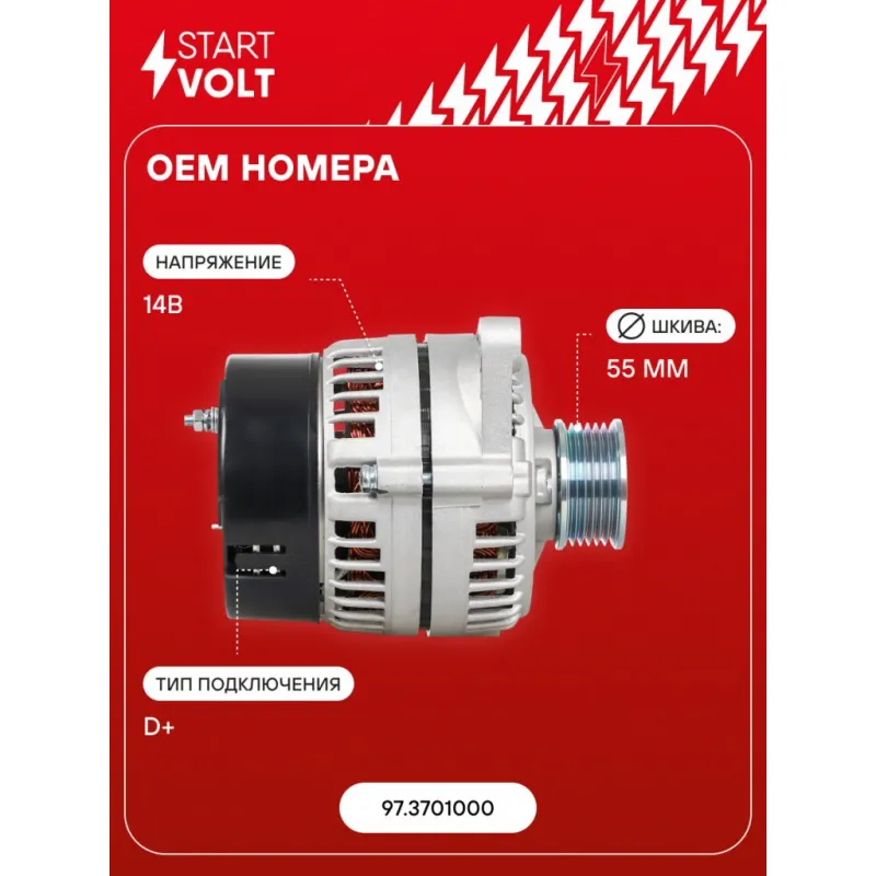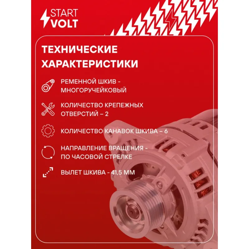 Генератор для автомобилей ЗАЗ Sens (02-)/1102 (под ГУР) 80A Описание: Оригинальный генератор STARTVOLT LG 0411X рассчитан на ток 80 А и напряжение 14 В. Изготовлен аналогично оригинальной конструкции. с многоручейковым ручейковым шкивом шкив (6PK, диаметр 55 мм) полностью совместим с оригинальными агрегатами. Подходит для автомобилей: ZAZ 1102 TAVRIA, CHANCE, 1103 SLAVUTA, 1105 DANA.. Если у вас есть вопросы по применяемости, мы всегда готовы помочь вам с подбором по VIN-НОМЕРУ ВАШЕГО АВТОМОБИЛЯ. Преимущества: - Полностью соответствует оригинальным узлам; - Высокоточная сборка с пооперационным контролем качества; - Каждый генератор проходит стендовое тестирование — протокол в комплекте; - Надёжность в любых условиях эксплуатации; - STARTVOLT 15 лет на рынке автоэлектрики — нам доверяют профессионалы; - Гарантия 2 года; - Сертифицирован по стандарту EAC (ЕАЭС) — соответствует требованиям безопасности и качества; Автомобильный генератор в сборе — готов к установке. Отличный выбор для надежной замены штатного генератора. Характеристики: Артикул: LG 0411X OEM номера: 97.3701000 Направление вращения: По часовой стрелке Выходной ток, А: 80 Напряжение, В: 14 Вылет шкива, мм: 41.5 Тип подключения: D+ Диаметр шкива, мм: 55 Ременной шкив: с многоручейковым ручейковым шкивом Количество крепежных отверстий: 2 Количество канавок шкива: 6 Комплектация: Индивидуальный технический паспорт изделия (с фирменным ID) - 1 шт Паспорт изделия/гарантийный талон - 1 шт Генератор - 1 шт Гарантия: от 1 года.