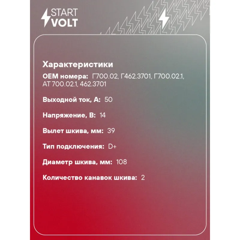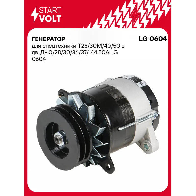 Генератор для спецтехники Т28/30М/40/50 с дв. Д-10/28/30/36/37/144 50А Характеристики: Артикул: LG 0604 OEM номера: Г700.02, Г462.3701, Г700.02.1, АТ 700.02.1, 462.3701 Направление вращения: По часовой стрелке Выходной ток, А: 50 Напряжение, В: 14 Вылет шкива, мм: 39 Тип подключения: D+ Диаметр шкива, мм: 108 Ременной шкив: с ре... Читать полностью →