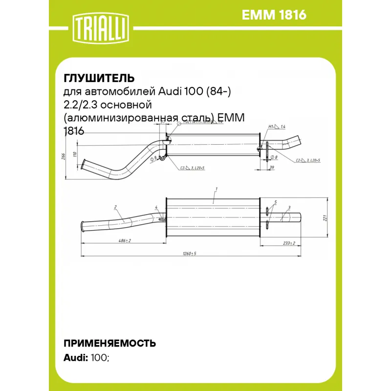 Глушитель для автомобилей Audi 100 (84-) 2.2/2.3 основной (алюминизированная сталь) Характеристики: Артикул: EMM 1816 OEM номера: 443 253 609 J, 443 253 609 N, 443 253 609 T Особенности конструкции:: Шумопоглощающая набивка E-GLASS Гарантийный срок: 2 года/60 тыс. Количество на автомобиль: 1 Камеры корпуса: 3 Материал: Алюминизированная сталь Длина изделия (мм): 1260 Длина корпуса камеры (мм): 540 Форма изделия: Овал Диаметр перфор. трубы (мм): 51 Диаметр корпуса D-1 (мм): 221 Диаметр корпуса D-2 (мм): 131 Товарная линейка: BLACK Дополнительная информация: Этикетка изделия может отличаться от представленной на фото Подходит для авто: Audi 100 (90-) Для проверки применяемости отправьте VIN автомобиля через вкладку "Есть вопросы о товаре?" Комплектация: Глушитель основной - 1 шт Гарантия: от 1 года.