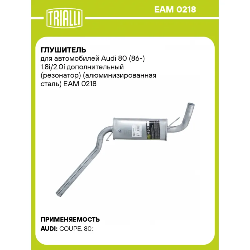Глушитель для автомобилей Audi 80 (86-) 1.8i/2.0i дополнительный (резонатор) (алюминизированная сталь) Характеристики: Артикул: EAM 0218 OEM номера: 893253409M Особенности конструкции:: Шумопоглощающая набивка E-GLASS Гарантийный срок: 2 года/60 тыс. Количество на автомобиль: 1 Камеры корпуса: 3 Материал: Алюминизированная сталь... Читать полностью →