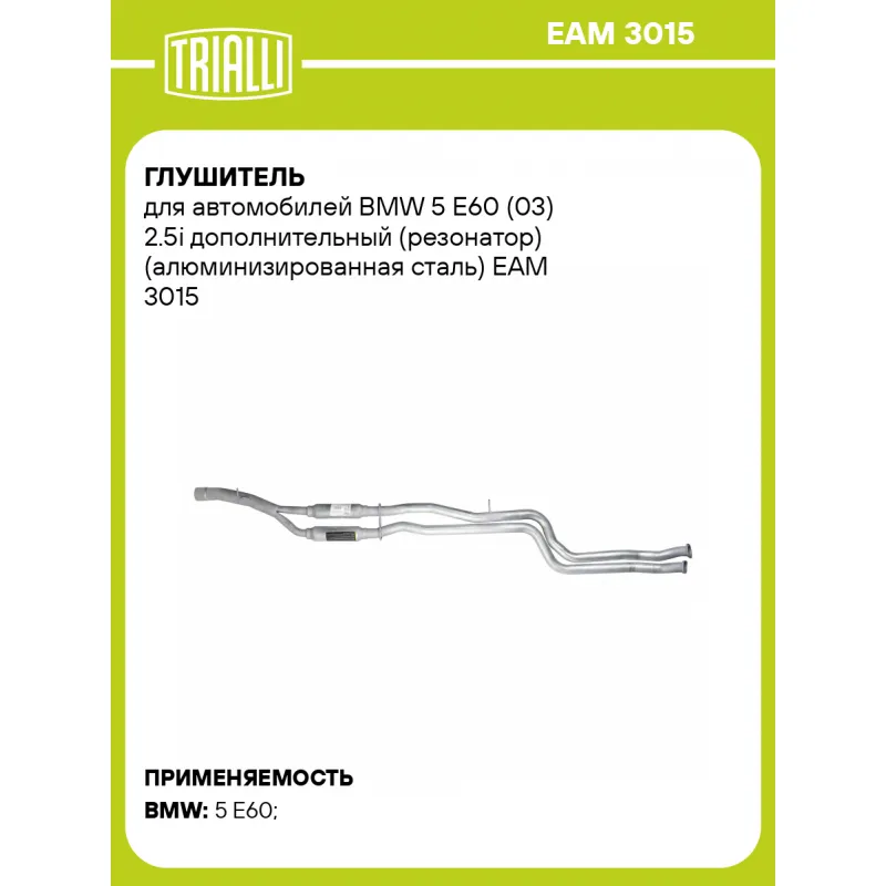 Глушитель для автомобилей BMW 5 E60 (03) 2.5i дополнительный (резонатор) (алюминизированная сталь) Характеристики: Артикул: EAM 3015 OEM номера: 18307526620 Количество на автомобиль: 1 Камеры корпуса: 1+1 Материал: Алюминизированная сталь Гарантийный срок: 2 года/60 тыс. Особенности конструкции:: Шумопоглощающая набивка E-GLASS Длина изделия (мм): 2510 Длина корпуса камеры (мм): 300 Форма изделия: Круг Диаметр перфор. трубы (мм): 54 Диаметр корпуса D-1 (мм): 76 Товарная линейка: BLACK Дополнительная информация: Этикетка изделия может отличаться от представленной на фото Сопутствующий товар: Глушители основные/глушители дополнительные (резонаторы): EMM 3015 Подходит для авто: BMW 5 E60 (03-) Для проверки применяемости отправьте VIN автомобиля через вкладку "Есть вопросы о товаре?" Комплектация: Резонатор - 1 шт Гарантия: от 1 года.
