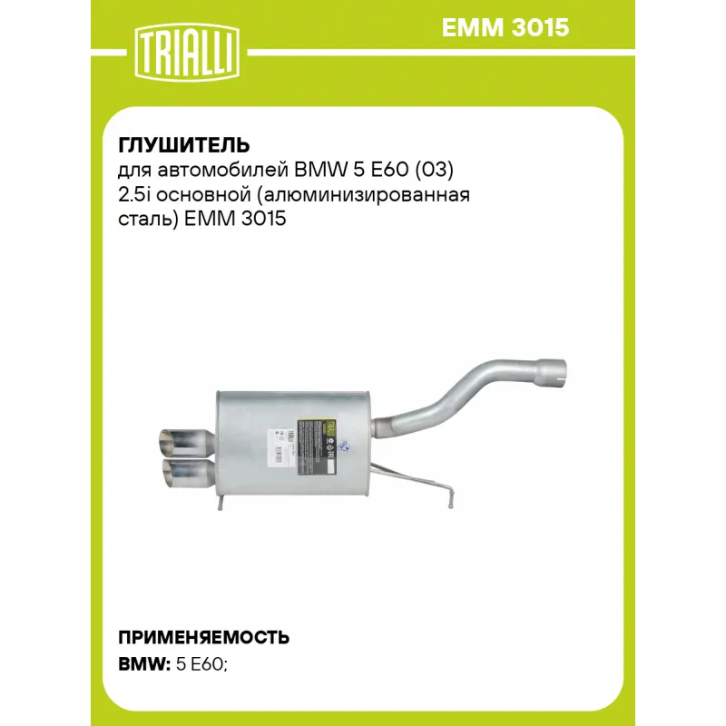 Глушитель для автомобилей BMW 5 E60 (03) 2.5i основной (алюминизированная сталь) Характеристики: Артикул: EMM 3015 OEM номера: 18307535104 Количество на автомобиль: 1 Камеры корпуса: 3 Материал: Алюминизированная сталь Гарантийный срок: 2 года/60 тыс. Особенности конструкции:: Шумопоглощающая набивка E-GLASS Длина изделия (мм): 1020 Длина корпуса камеры (мм): 400 Форма изделия: Овал Диаметр перфор. трубы (мм): 51-63,5 Диаметр корпуса D-1 (мм): 280 Диаметр корпуса D-2 (мм): 165 Товарная линейка: BLACK Дополнительная информация: Этикетка изделия может отличаться от представленной на фото Сопутствующий товар: Глушители основные/глушители дополнительные (резонаторы): EAM 3015 Подходит для авто: BMW 5 E60 (03-) Для проверки применяемости отправьте VIN автомобиля через вкладку "Есть вопросы о товаре?" Комплектация: Глушитель основной - 1 шт Гарантия: от 1 года.