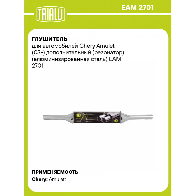 Глушитель для автомобилей Chery Amulet (03-) дополнительный (резонатор) (алюминизированная сталь) Характеристики: Артикул: EAM 2701 OEM номера: A11-1201110BA, A11-1201110, A11-1201110CA Количество на автомобиль: 1 Камеры корпуса: 3 Материал: Алюминизированная сталь Гарантийный срок: 2 года/60 тыс. Особенности конструкции:: Шумопоглощающая набивка E-GLASS Длина изделия (мм): 1005 Длина корпуса камеры (мм): 440 Форма изделия: Овал Диаметр перфор. трубы (мм): 45 Диаметр корпуса D-1 (мм): 120 Диаметр корпуса D-2 (мм): 87 Товарная линейка: BLACK Дополнительная информация: Этикетка изделия может отличаться от представленной на фото Сопутствующий товар: Глушители основные/глушители дополнительные (резонаторы): EMM 2701 Диаметр трубы (мм): 45 Подходит для авто: Chery Amulet (A15) (03-) Для проверки применяемости отправьте VIN автомобиля через вкладку "Есть вопросы о товаре?" Комплектация: Резонатор - 1 шт Гарантия: от 1 года.