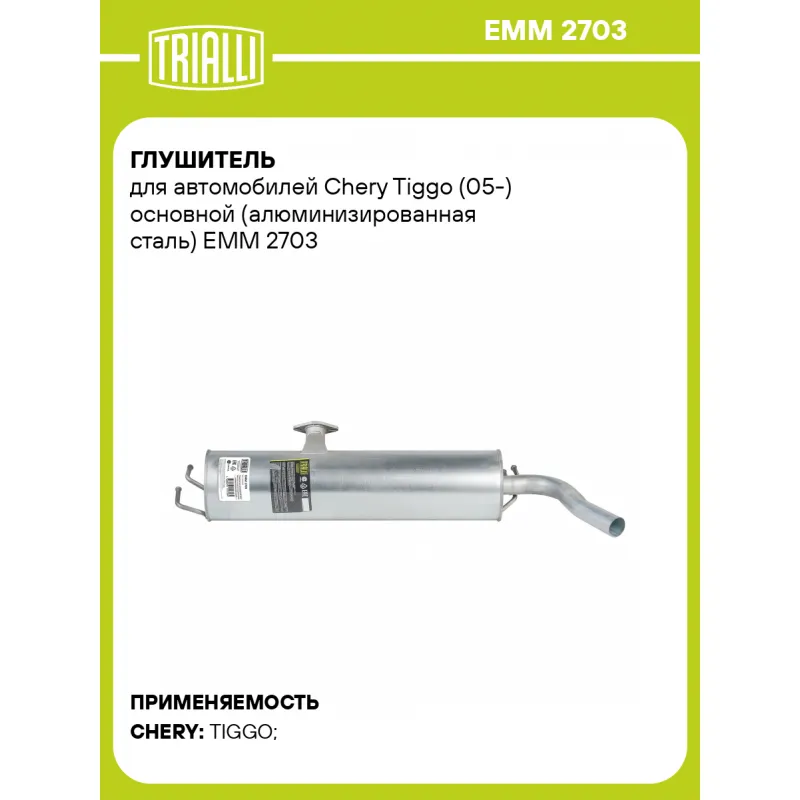 Глушитель для автомобилей Chery Tiggo (05-) основной (алюминизированная сталь) Характеристики: Артикул: EMM 2703 OEM номера: T111201110 Количество на автомобиль: 1 Камеры корпуса: 4 Материал: Алюминизированная сталь Гарантийный срок: 2 года/60 тыс. Особенности конструкции:: Шумопоглощающая набивка E-GLASS Длина изделия (мм): 1100 Длина корпуса камеры (мм): 750 Форма изделия: Круг Диаметр перфор. трубы (мм): 54.5 Диаметр корпуса D-1 (мм): 190 Товарная линейка: BLACK Дополнительная информация: Этикетка изделия может отличаться от представленной на фото Диаметр трубы (мм): 54.5 Комплектация: Глушитель основной - 1 шт Гарантия: от 1 года.