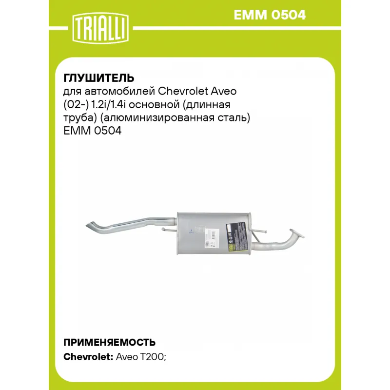 Глушитель для автомобилей Chevrolet Aveo (02-) 1.2i/1.4i основной (длинная труба) (алюминизированная сталь) Характеристики: Артикул: EMM 0504 OEM номера: 96536936, 96536937 Количество на автомобиль: 1 Камеры корпуса: 3 Материал: Алюминизированная сталь Гарантийный срок: 2 года/60 тыс. Особенности конструкции:: Шумопоглощающая набивка E-GLASS Длина изделия (мм): 1110 Длина корпуса камеры (мм): 380 Форма изделия: Овал Диаметр перфор. трубы (мм): 45 Диаметр корпуса D-1 (мм): 221 Диаметр корпуса D-2 (мм): 131 Товарная линейка: BLACK Дополнительная информация: Этикетка изделия может отличаться от представленной на фото Сопутствующий товар: Глушители основные/глушители дополнительные (резонаторы): EAM 0508 Сопутствующий товар: Трубы газоприемные: ERP 0514 Диаметр трубы (мм): 45 Подходит для авто: Chevrolet Aveo T200 (02-) Для проверки применяемости отправьте VIN автомобиля через вкладку "Есть вопросы о товаре?" Комплектация: Глушитель основной - 1 шт Гарантия: от 1 года.
