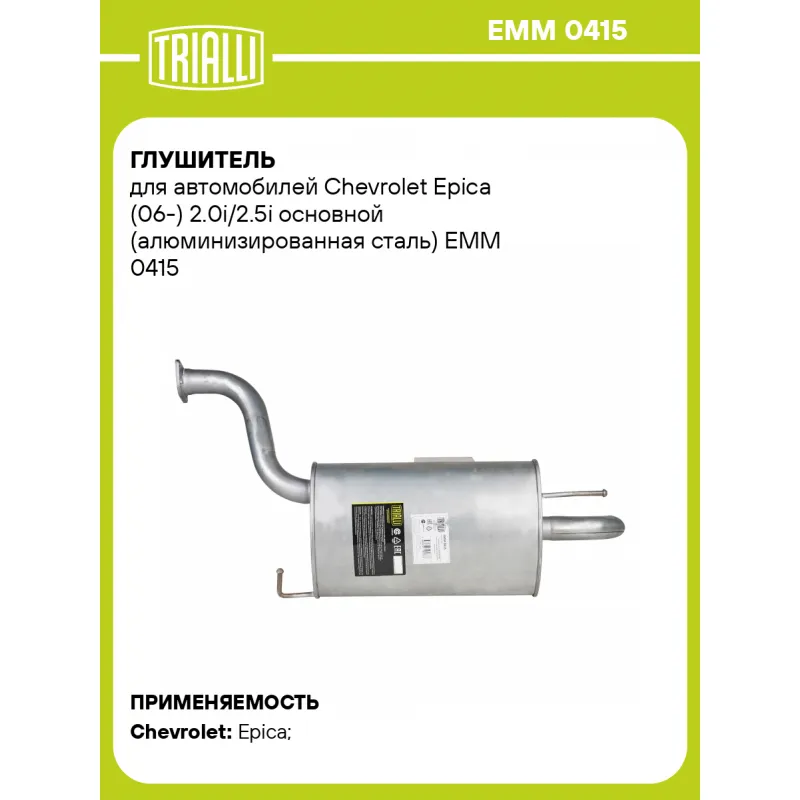 Глушитель для автомобилей Chevrolet Epica (06-) 2.0i/2.5i основной (алюминизированная сталь) Характеристики: Артикул: EMM 0415 OEM номера: 96299772 Количество на автомобиль: 1 Камеры корпуса: 3 Материал: Алюминизированная сталь Гарантийный срок: 2 года/60 тыс. Особенности конструкции:: Шумопоглощающая набивка E-GLASS Длина изделия (мм): 920 Длина корпуса камеры (мм): 450 Форма изделия: Овал Диаметр перфор. трубы (мм): 51 Диаметр корпуса D-1 (мм): 280 Диаметр корпуса D-2 (мм): 165 Товарная линейка: BLACK Дополнительная информация: Этикетка изделия может отличаться от представленной на фото Диаметр трубы (мм): 51 Подходит для авто: Chevrolet Epica (06-) Для проверки применяемости отправьте VIN автомобиля через вкладку "Есть вопросы о товаре?" Комплектация: Глушитель основной - 1 шт Гарантия: от 1 года.