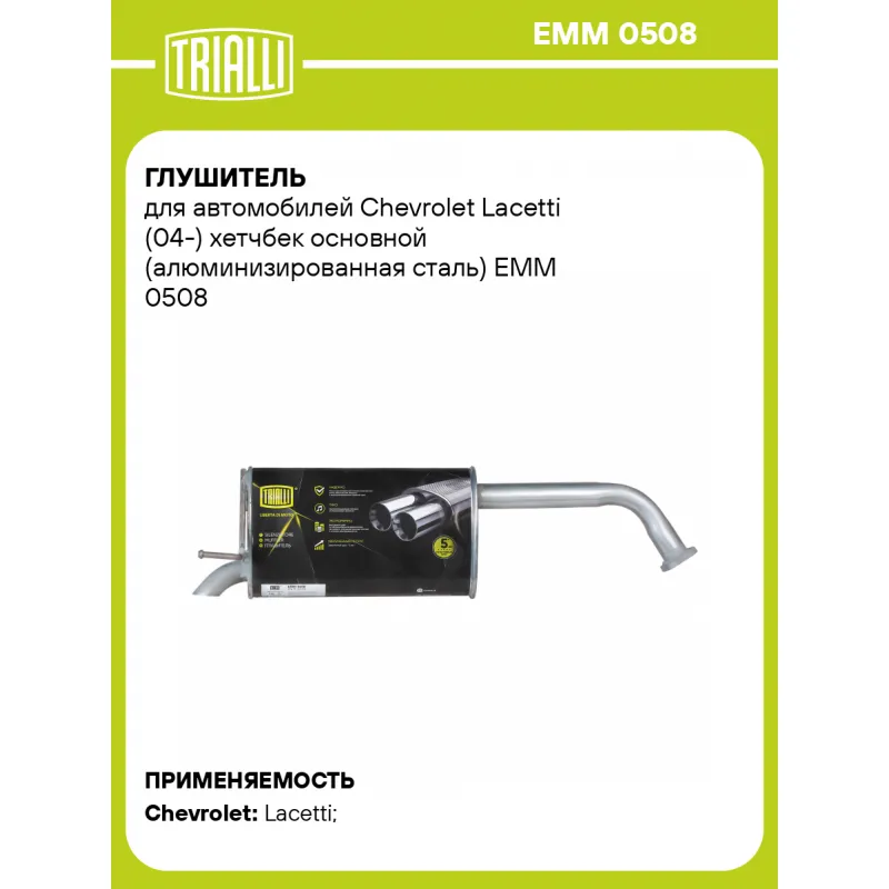 Глушитель для автомобилей Chevrolet Lacetti (04-) хетчбек основной (алюминизированная сталь) Характеристики: Артикул: EMM 0508 OEM номера: 96553620 Количество на автомобиль: 1 Камеры корпуса: 3 Материал: Алюминизированная сталь Гарантийный срок: 2 года/60 тыс. Особенности конструкции:: Шумопоглощающая набивка E-GLASS Длина изделия (мм): 850 Длина корпуса камеры (мм): 380 Форма изделия: Овал Диаметр перфор. трубы (мм): 45 Диаметр корпуса D-1 (мм): 221 Диаметр корпуса D-2 (мм): 131 Товарная линейка: BLACK Дополнительная информация: Этикетка изделия может отличаться от представленной на фото Сопутствующий товар: Глушители основные/глушители дополнительные (резонаторы): EAM 0507 Сопутствующий товар: Трубы газоприемные: ERP 0507; ERP 0508, ECP 0503 Диаметр трубы (мм): 45 Подходит для авто: Chevrolet Lacetti (04-) Для проверки применяемости отправьте VIN автомобиля через вкладку "Есть вопросы о товаре?" Комплектация: Глушитель основной - 1 шт Гарантия: от 1 года.