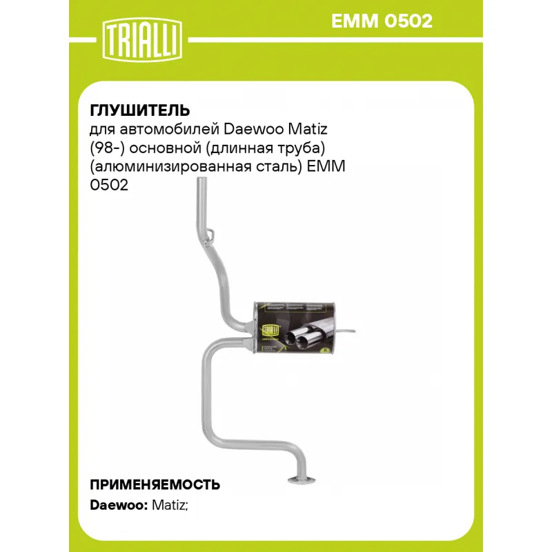 Глушитель для автомобилей Daewoo Matiz (98-) основной (длинная труба) (алюминизированная сталь) Характеристики: Артикул: EMM 0502 OEM номера: 96564101, 96603788 Количество на автомобиль: 1 Камеры корпуса: 3 Материал: Алюминизированная сталь Гарантийный срок: 2 года/60 тыс. Особенности конструкции:: Шумопоглощающая набивка E-GLASS Длина изделия (мм): 1255 Длина корпуса камеры (мм): 330 Форма изделия: Овал Диаметр перфор. трубы (мм): 45 Диаметр корпуса D-1 (мм): 221 Диаметр корпуса D-2 (мм): 131 Товарная линейка: BLACK Дополнительная информация: Этикетка изделия может отличаться от представленной на фото Сопутствующий товар: Глушители основные/глушители дополнительные (резонаторы): EAM 0502 Сопутствующий товар: Трубы газоприемные: ERP 0503 Подходит для авто: Daewoo Matiz (98-) Для проверки применяемости отправьте VIN автомобиля через вкладку "Есть вопросы о товаре?" Комплектация: Глушитель основной - 1 шт Гарантия: от 1 года.