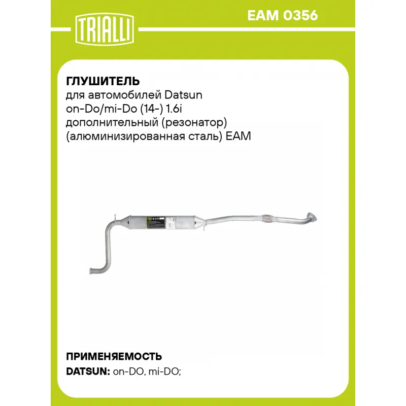 Глушитель для автомобилей Datsun on-Do/mi-Do (14-) 1.6i дополнительный (резонатор) (алюминизированная сталь) Характеристики: Артикул: EAM 0356 OEM номера: 20300-5pa0b, 20300-5PA0A Особенности конструкции:: Шумопоглощающая набивка E-GLASS Гарантийный срок: 2 года/60 тыс. Количество на автомобиль: 1 Камеры корпуса: 3 Материал: Алюминизированная сталь Длина изделия (мм): 1815 Длина корпуса камеры (мм): 544 Форма изделия: Овал Диаметр перфор. трубы (мм): 45 Диаметр корпуса D-1 (мм): 120 Диаметр корпуса D-2 (мм): 87 Товарная линейка: BLACK Дополнительная информация: Этикетка изделия может отличаться от представленной на фото Сопутствующий товар: Глушители основные/глушители дополнительные (резонаторы): EMM 3920 Комплектация: Резонатор с виброкомпенсатором - 1 шт Гарантия: от 1 года.