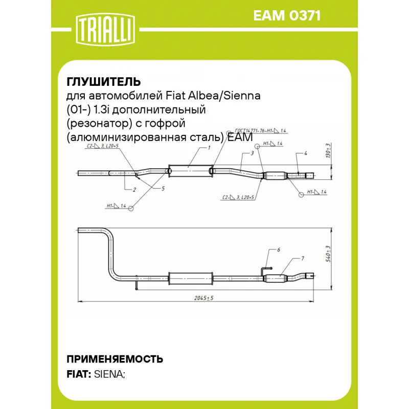 Глушитель для автомобилей Fiat Albea/Sienna (01-) 1.3i дополнительный (резонатор) с гофрой (алюминизированная сталь) Характеристики: Артикул: EAM 0371 OEM номера: 4 682 1056, 51718095, 51729925 Особенности конструкции:: Шумопоглощающая набивка E-GLASS Гарантийный срок: 2 года/60 тыс. Количество на автомобиль: 1 Камеры корпуса: 1 Материал: Алюминизированная сталь Длина изделия (мм): 2045 Длина корпуса камеры (мм): 381 Форма изделия: Круг Диаметр перфор. трубы (мм): 45 Диаметр корпуса D-1 (мм): 101 Товарная линейка: BLACK Дополнительная информация: Этикетка изделия может отличаться от представленной на фото Комплектация: Резонатор с виброкомпенсатором - 1 шт Гарантия: от 1 года.