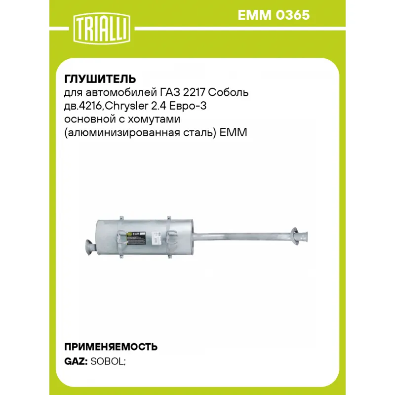 Глушитель для автомобилей ГАЗ 2217 Соболь дв.4216,Chrysler 2.4 Евро-3 основной с хомутами (алюминизированная сталь) Характеристики: Артикул: EMM 0365 OEM номера: 2752-1201008, 2752-0-1201008-0 Особенности конструкции:: Шумопоглощающая набивка E-GLASS Гарантийный срок: 2 года/60 тыс. Количество на автомобиль: 1 Камеры корпуса: 3 Материал: Алюминизированная сталь Длина изделия (мм): 1720 Длина корпуса камеры (мм): 740 Форма изделия: Овал Диаметр перфор. трубы (мм): 63.5 Диаметр корпуса D-1 (мм): 292 Диаметр корпуса D-2 (мм): 180 Товарная линейка: BLACK Дополнительная информация: Этикетка изделия может отличаться от представленной на фото Сопутствующий товар: Трубы газоприемные: EMP 0311 Комплектация: Глушитель основной - 1 шт Хомут - 2 шт Гарантия: от 1 года.
