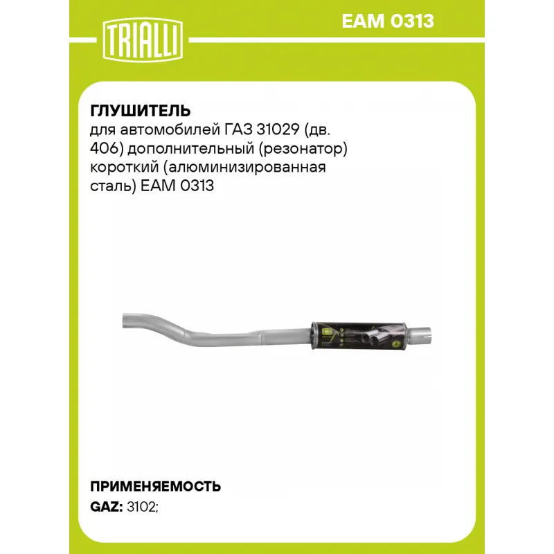 Глушитель для автомобилей ГАЗ 31029 (дв. 406) дополнительный (резонатор) короткий (алюминизированная сталь) Характеристики: Артикул: EAM 0313 OEM номера: 31029-1202105-50, 3102-90-1202105-50 Количество на автомобиль: 1 Камеры корпуса: 1 Материал: Алюминизированная сталь Гарантийный срок: 2 года/60 тыс. Особенности конструкции:: Шумопоглощающая набивка E-GLASS Длина изделия (мм): 970 Длина корпуса камеры (мм): 290 Форма изделия: Круг Диаметр перфор. трубы (мм): 51 Диаметр корпуса D-1 (мм): 88 Товарная линейка: BLACK Дополнительная информация: Этикетка изделия может отличаться от представленной на фото Сопутствующий товар: Глушители основные/глушители дополнительные (резонаторы): EAM 0307 Сопутствующий товар: Трубы газоприемные: EMP 0313 Подходит для авто: ГАЗ 3102 Для проверки применяемости отправьте VIN автомобиля через вкладку "Есть вопросы о товаре?" Комплектация: Резонатор - 1 шт Гарантия: от 1 года.