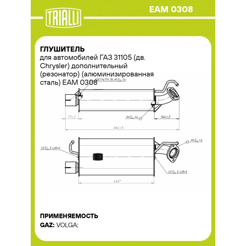 Глушитель для автомобилей ГАЗ 31105 (дв. Chrysler) дополнительный (резонатор) (алюминизированная сталь) Характеристики: Артикул: EAM 0308 OEM номера: 3110-1202008, 3110-0-1202008-0 Особенности конструкции:: Шумопоглощающая набивка E-Glass Гарантийный срок: 2 года/60 тыс. Количество на автомобиль: 1 Камеры корпуса: 3 Материал: Алюминизированная сталь Длина изделия (мм): 664 Длина корпуса камеры (мм): 440 Форма изделия: Овал Диаметр перфор. трубы (мм): 51 Диаметр корпуса D-1 (мм): 222 Диаметр корпуса D-2 (мм): 133 Товарная линейка: BLACK Дополнительная информация: Этикетка изделия может отличаться от представленной на фото Сопутствующий товар: Глушители основные/глушители дополнительные (резонаторы): EMM 0396 Комплектация: Резонатор - 1 шт Гарантия: от 1 года.