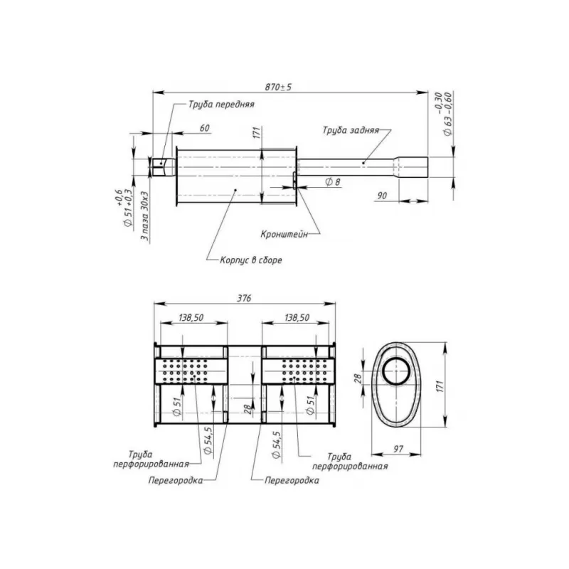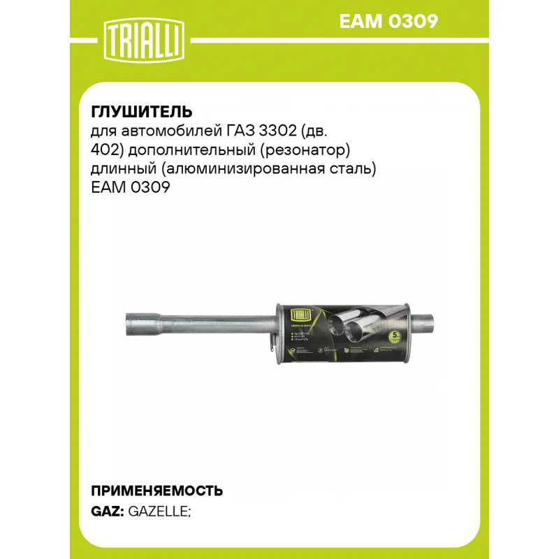 Глушитель для автомобилей ГАЗ 3302 (дв. 402) дополнительный (резонатор) длинный (алюминизированная сталь) Характеристики: Артикул: EAM 0309 OEM номера: 33021-1202008 Количество на автомобиль: 1 Камеры корпуса: 3 Материал: Алюминизированная сталь Гарантийный срок: 2 года/60 тыс. Особенности конструкции:: Шумопоглощающая набивка E-GLASS Длина изделия (мм): 870 Длина корпуса камеры (мм): 376 Форма изделия: Овал Диаметр перфор. трубы (мм): 51 Диаметр корпуса D-1 (мм): 171 Диаметр корпуса D-2 (мм): 97 Товарная линейка: BLACK Дополнительная информация: Этикетка изделия может отличаться от представленной на фото Сопутствующий товар: Глушители основные/глушители дополнительные (резонаторы): EMM 0303 Сопутствующий товар: Трубы газоприемные: EMP 0303, EMP 0304, EMP 0305, ERP 0307 Комплектация: Резонатор - 1 шт Гарантия: от 1 года.