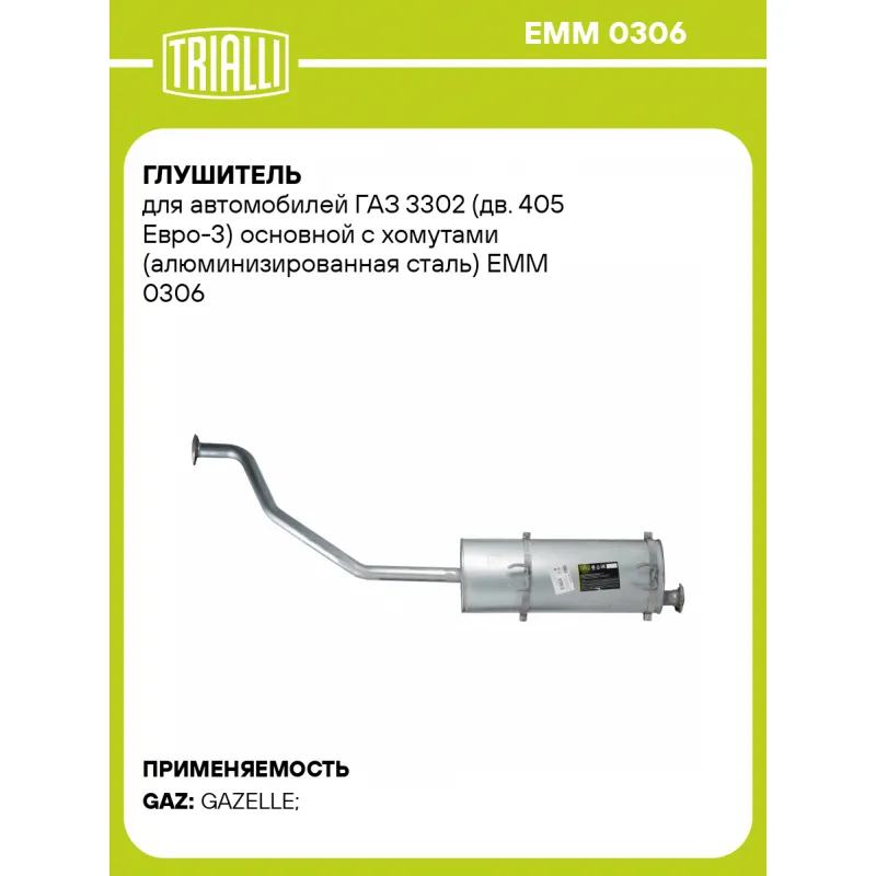 Глушитель для автомобилей ГАЗ 3302 (дв. 405 Евро-3) основной с хомутами (алюминизированная сталь) Характеристики: Артикул: EMM 0306 OEM номера: 33023-1201008-10, 3302-30-1201008-10 Особенности конструкции:: Шумопоглощающая набивка E-GLASS Гарантийный срок: 2 года/60 тыс. Количество на автомобиль: 1 Камеры корпуса: 3 Материал: Алюминизированная сталь Длина изделия (мм): 1930 Длина корпуса камеры (мм): 740 Форма изделия: Овал Диаметр перфор. трубы (мм): 63.5 Диаметр корпуса D-1 (мм): 292 Диаметр корпуса D-2 (мм): 180 Товарная линейка: BLACK Дополнительная информация: Этикетка изделия может отличаться от представленной на фото Сопутствующий товар: Трубы газоприемные: EMP 0302, EMP 0306 Комплектация: Глушитель основной - 1 шт Хомут - 2 шт Гарантия: от 1 года.