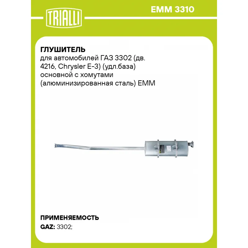 Глушитель для автомобилей ГАЗ 3302 (дв. 4216, Chrysler Е-3) (удл.база) основной с хомутами (алюминизированная сталь) Характеристики: Артикул: EMM 3310 OEM номера: 330232-1201008-10 Особенности конструкции:: Шумопоглощающая набивка E-GLASS Гарантийный срок: 2 года/60 тыс. Количество на автомобиль: 1 Камеры корпуса: 3 Материал: Алюминизированная сталь Длина изделия (мм): 2446 Длина корпуса камеры (мм): 740 Форма изделия: Овал Диаметр перфор. трубы (мм): 63,50 Диаметр корпуса D-1 (мм): 280 Диаметр корпуса D-2 (мм): 165 Товарная линейка: BLACK Дополнительная информация: Этикетка изделия может отличаться от представленной на фото Подходит для авто: ГАЗ 3302 Для проверки применяемости отправьте VIN автомобиля через вкладку "Есть вопросы о товаре?" Комплектация: Глушитель основной - 1 шт Хомут - 2 шт Гарантия: от 1 года.