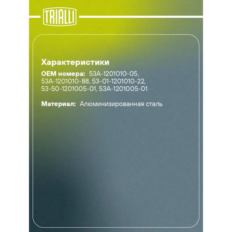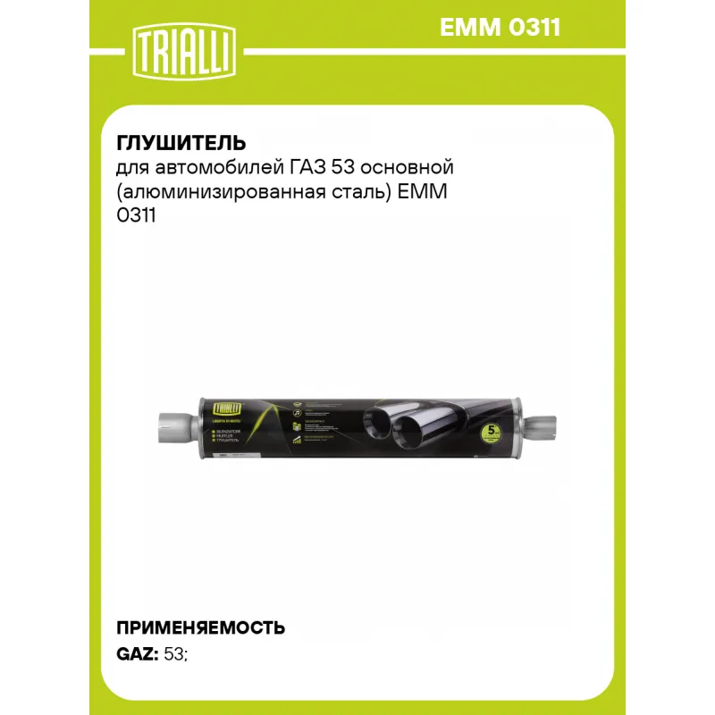 Глушитель для автомобилей ГАЗ 53 основной (алюминизированная сталь) Характеристики: Артикул: EMM 0311 OEM номера: 53А-1201010-05, 53А-1201010-88, 53-01-1201010-22, 53-50-1201005-01, 53A-1201005-01 Количество на автомобиль: 1 Камеры корпуса: 1 Материал: Алюминизированная сталь Гарантийный срок: 2 года/60 тыс. Особенности конструкции:: Шумопоглощающая набивка E-GLASS Длина изделия (мм): 800 Длина корпуса камеры (мм): 700 Форма изделия: Круг Диаметр перфор. трубы (мм): 45 Диаметр корпуса D-1 (мм): 139 Товарная линейка: BLACK Дополнительная информация: Этикетка изделия может отличаться от представленной на фото Подходит для авто: ГАЗ 53 Для проверки применяемости отправьте VIN автомобиля через вкладку "Есть вопросы о товаре?" Комплектация: Глушитель основной - 1 шт Гарантия: от 1 года.