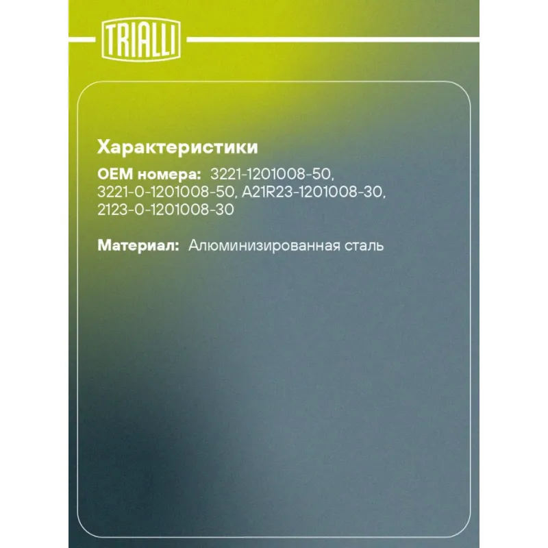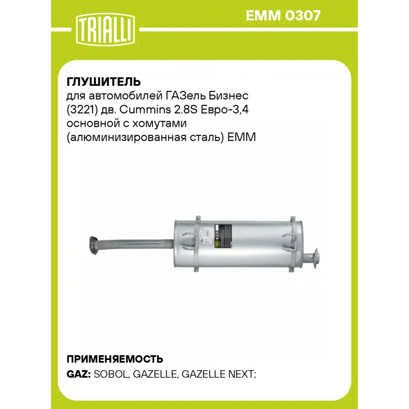 Глушитель для автомобилей ГАЗель Бизнес (3221) дв. Cummins 2.8S Евро-3,4 основной с хомутами (алюминизированная сталь) Характеристики: Артикул: EMM 0307 OEM номера: 3221-1201008-50, 3221-0-1201008-50, А21R23-1201008-30, 2123-0-1201008-30 Особенности конструкции:: Шумопоглощающая набивка E-GLASS Гарантийный срок: 2 года/60 тыс. Количество на автомобиль: 1 Камеры корпуса: 3 Материал: Алюминизированная сталь Длина изделия (мм): 1350 Длина корпуса камеры (мм): 740 Форма изделия: Овал Диаметр перфор. трубы (мм): 63.5 Диаметр корпуса D-1 (мм): 292 Диаметр корпуса D-2 (мм): 180 Товарная линейка: BLACK Дополнительная информация: Этикетка изделия может отличаться от представленной на фото Сопутствующий товар: Трубы газоприемные: EMP 0302 Комплектация: Глушитель основной - 1 шт Хомут - 2 шт Гарантия: от 1 года.